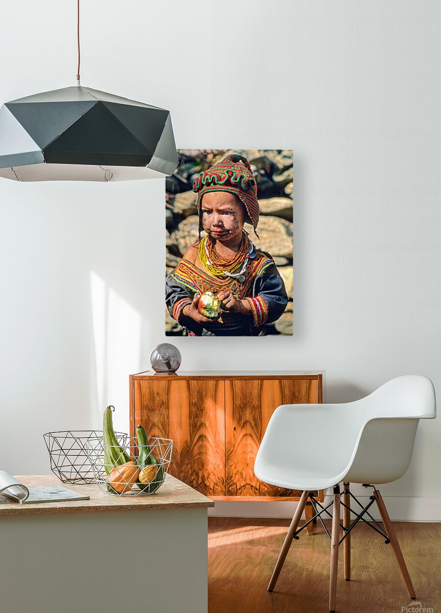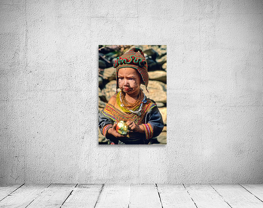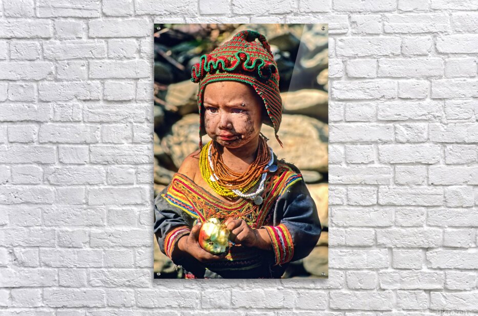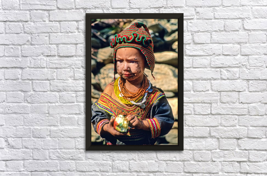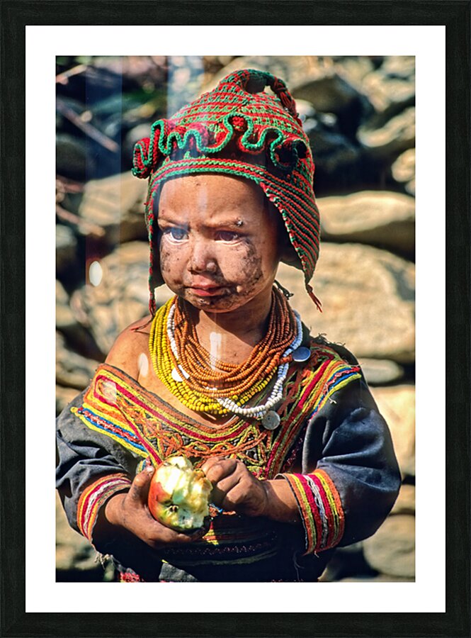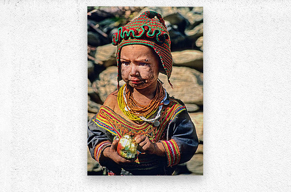 A child stands in Bumburet Valley wearing traditional dress and holding an apple. This scene shows daily life in a Kalash village.