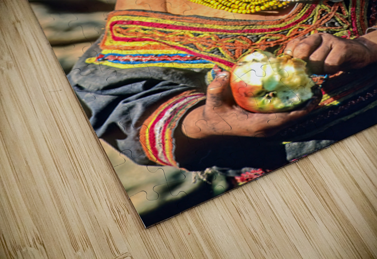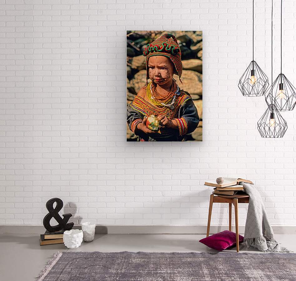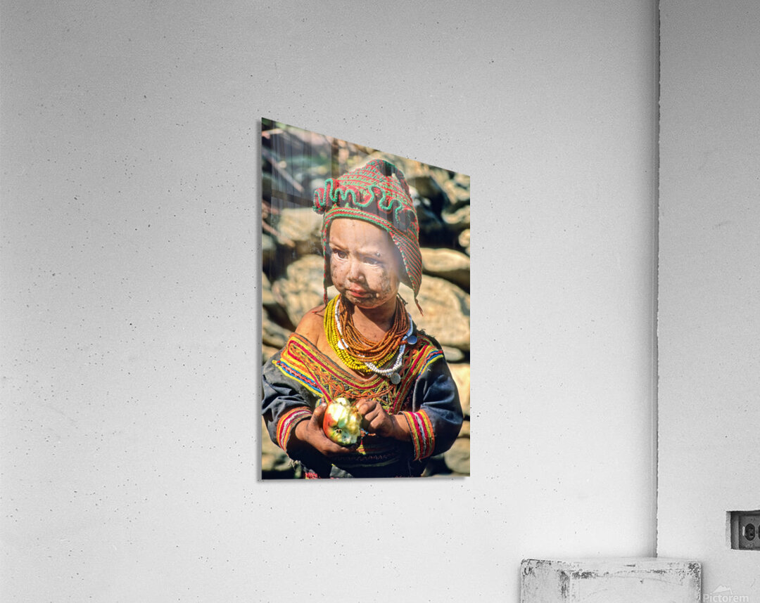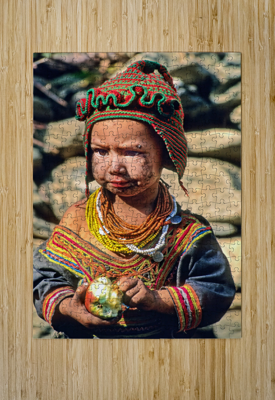 A child stands in Bumburet Valley wearing traditional dress and holding an apple. This scene shows daily life in a Kalash village.