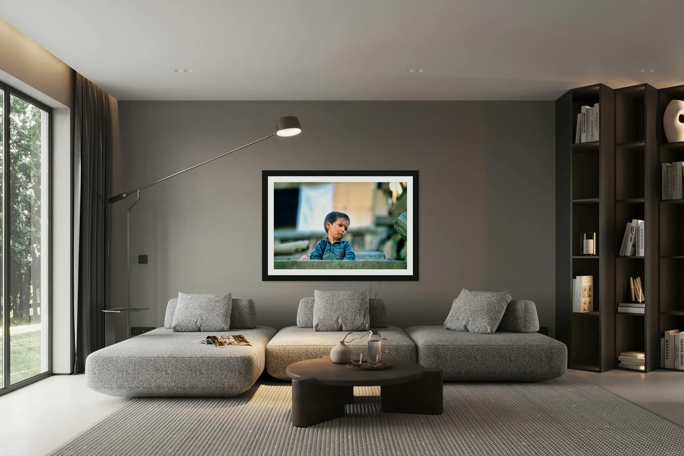 Sad boy sitting on stairs in Lahore Pakistan during the day Frame print