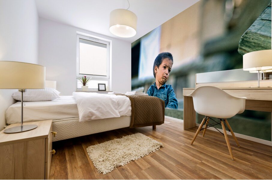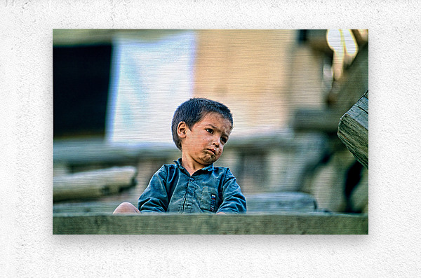 A boy with a sad expression sits on the stairs. He is in Lahore Pakistan during daytime. The background shows weathered wood.