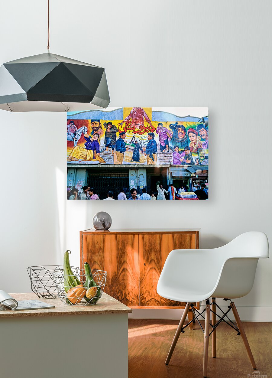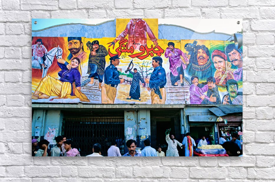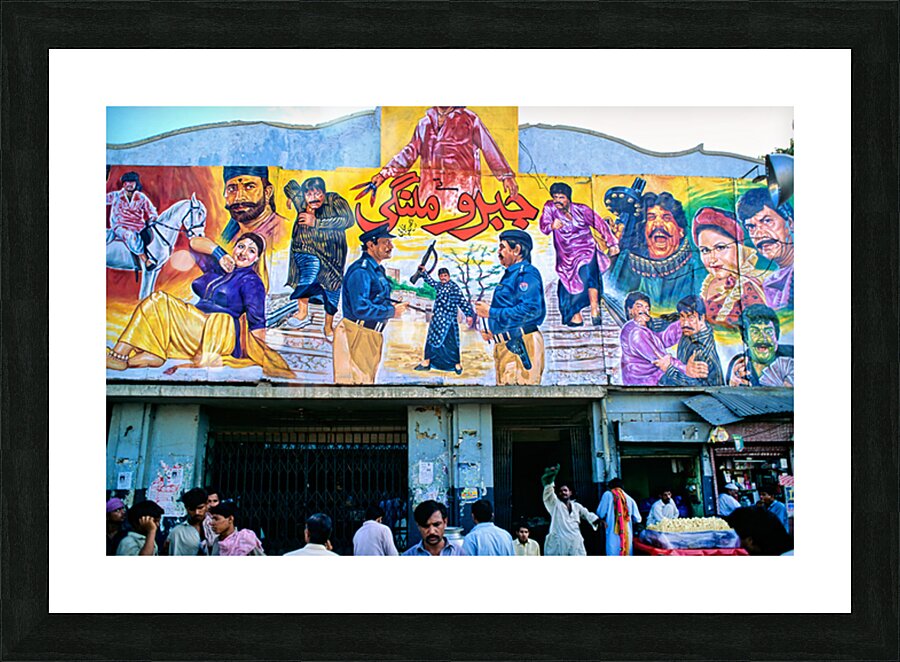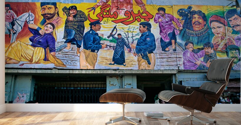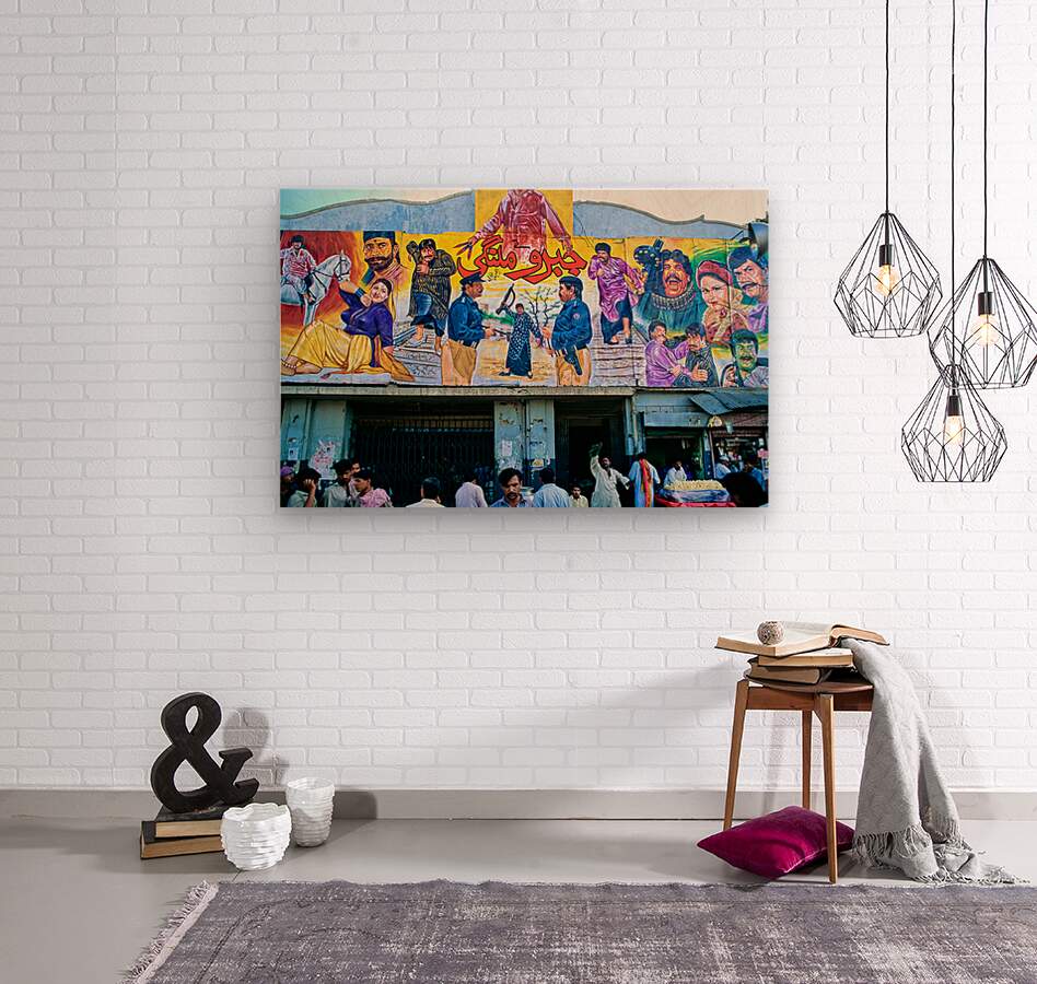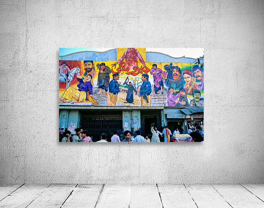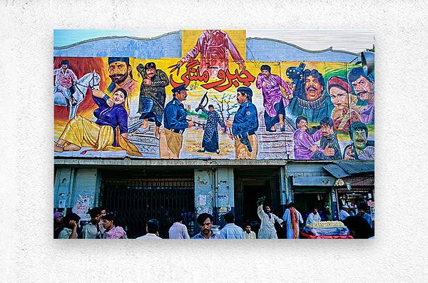 People gather outside a cinema in Lahore. Colorful murals display local stories and scenes. Different characters are part of the art.