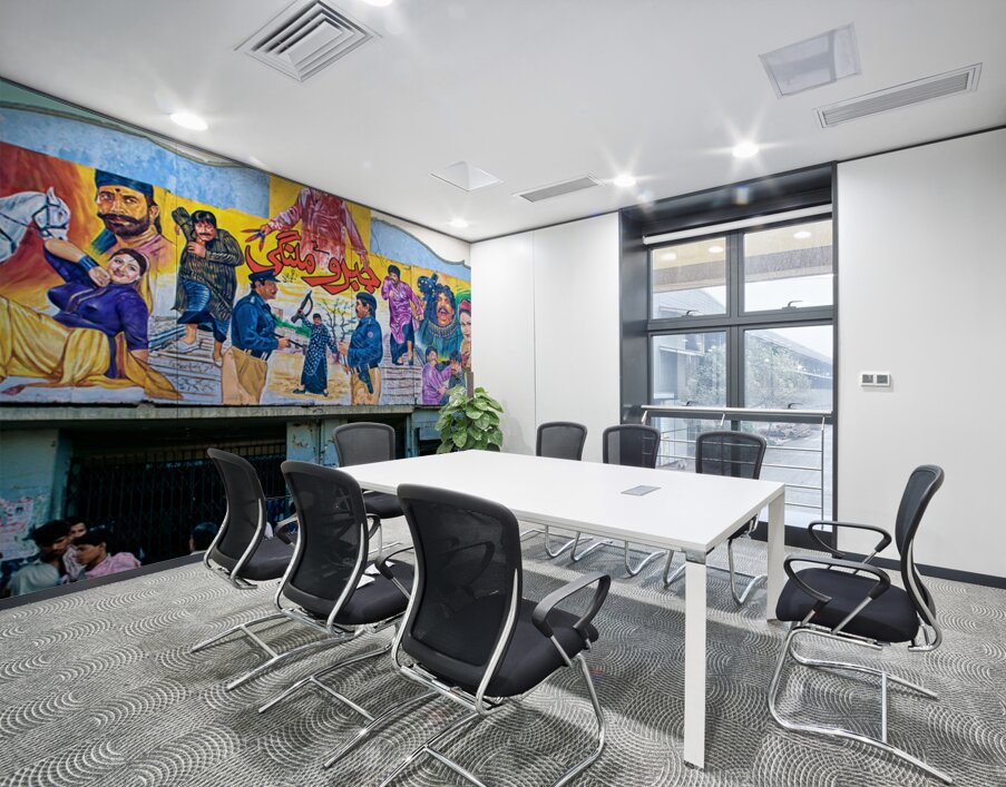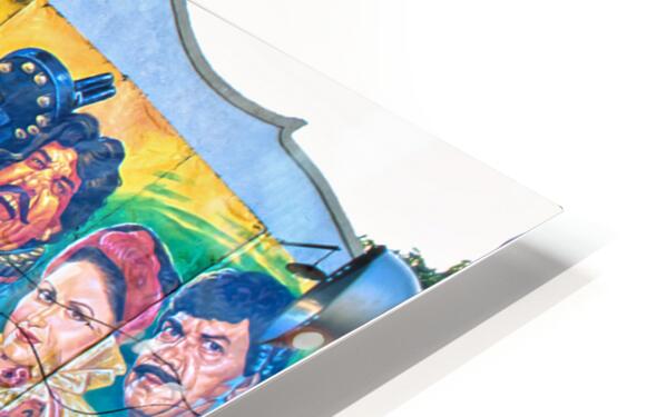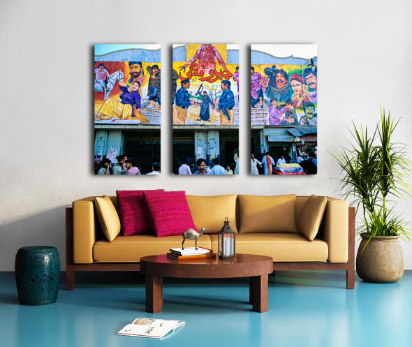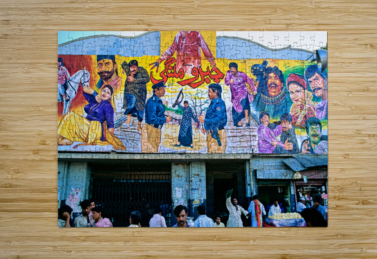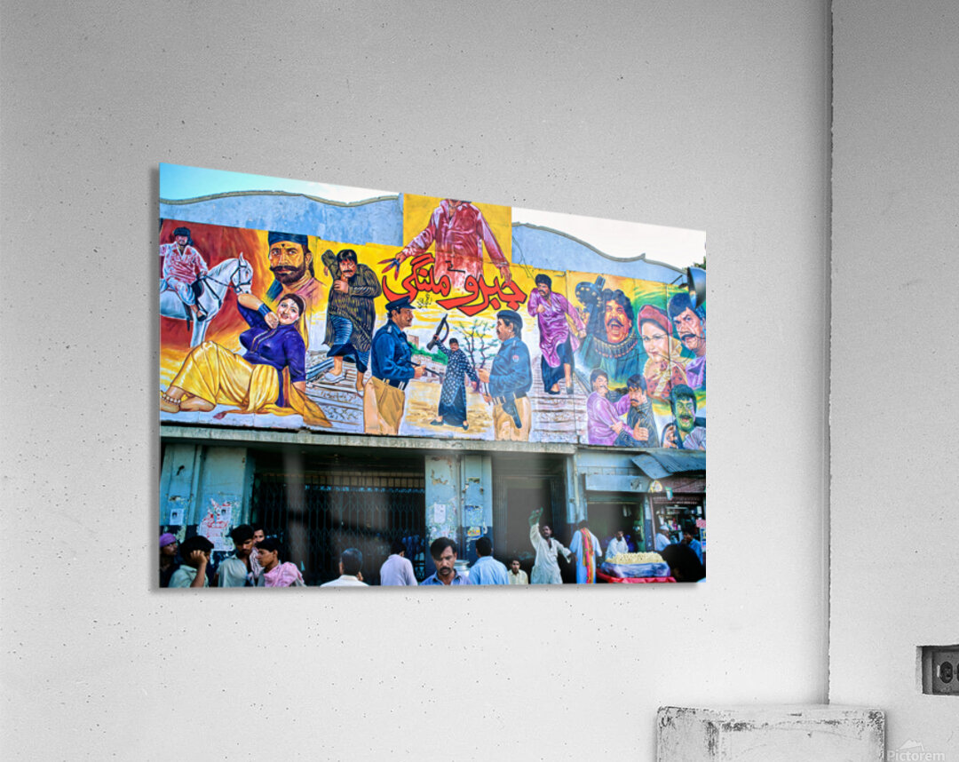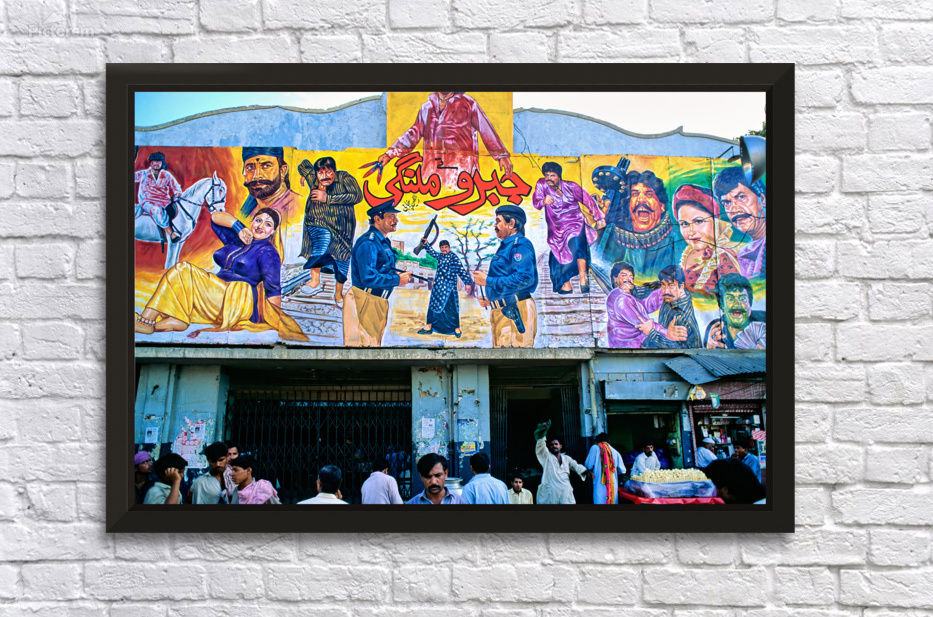 People gather outside a cinema in Lahore. Colorful murals display local stories and scenes. Different characters are part of the art.
