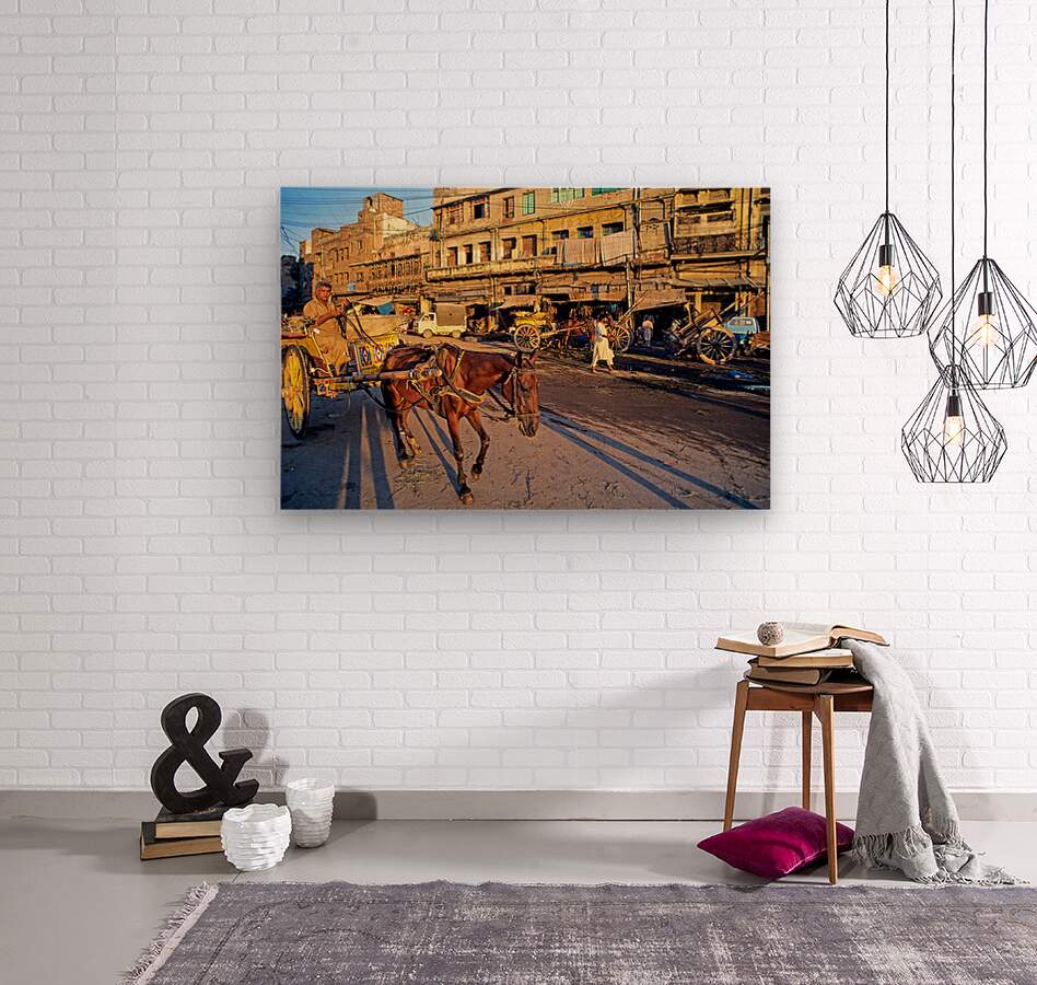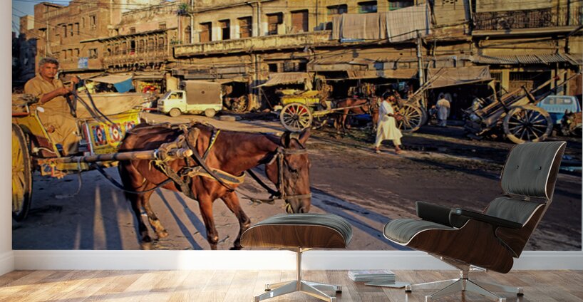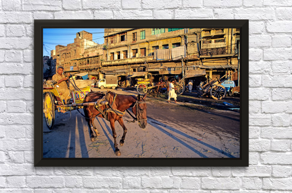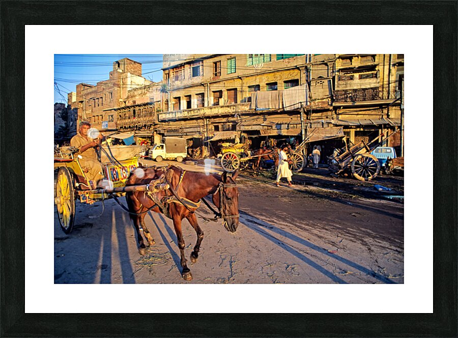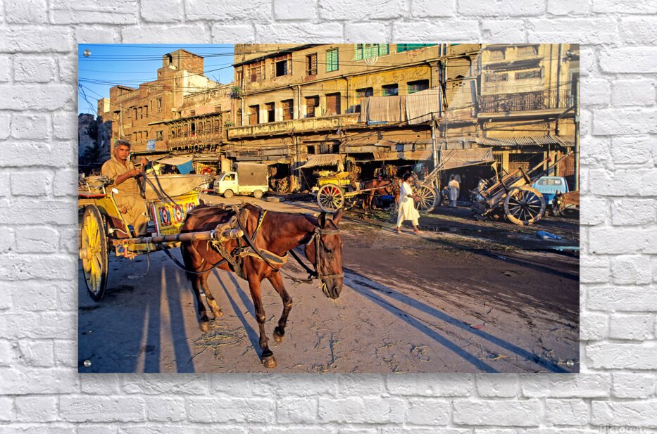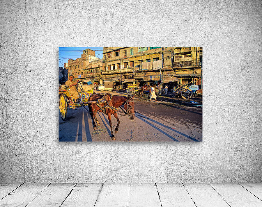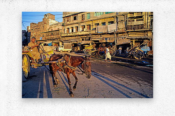 People move through lively streets in Lahore. A horse pulls a cart while others walk nearby. Shops line the road under the evening sky.