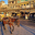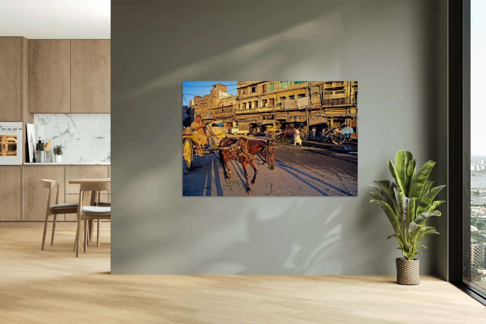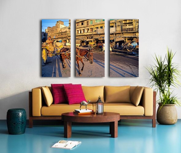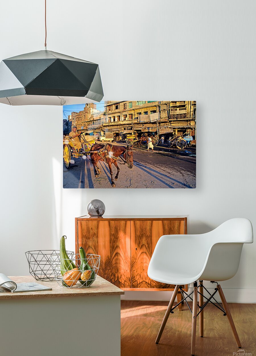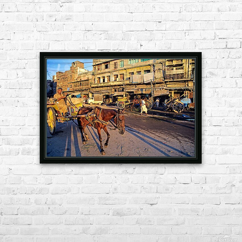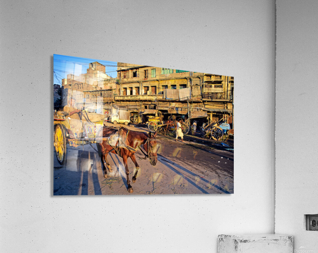 People move through lively streets in Lahore. A horse pulls a cart while others walk nearby. Shops line the road under the evening sky.