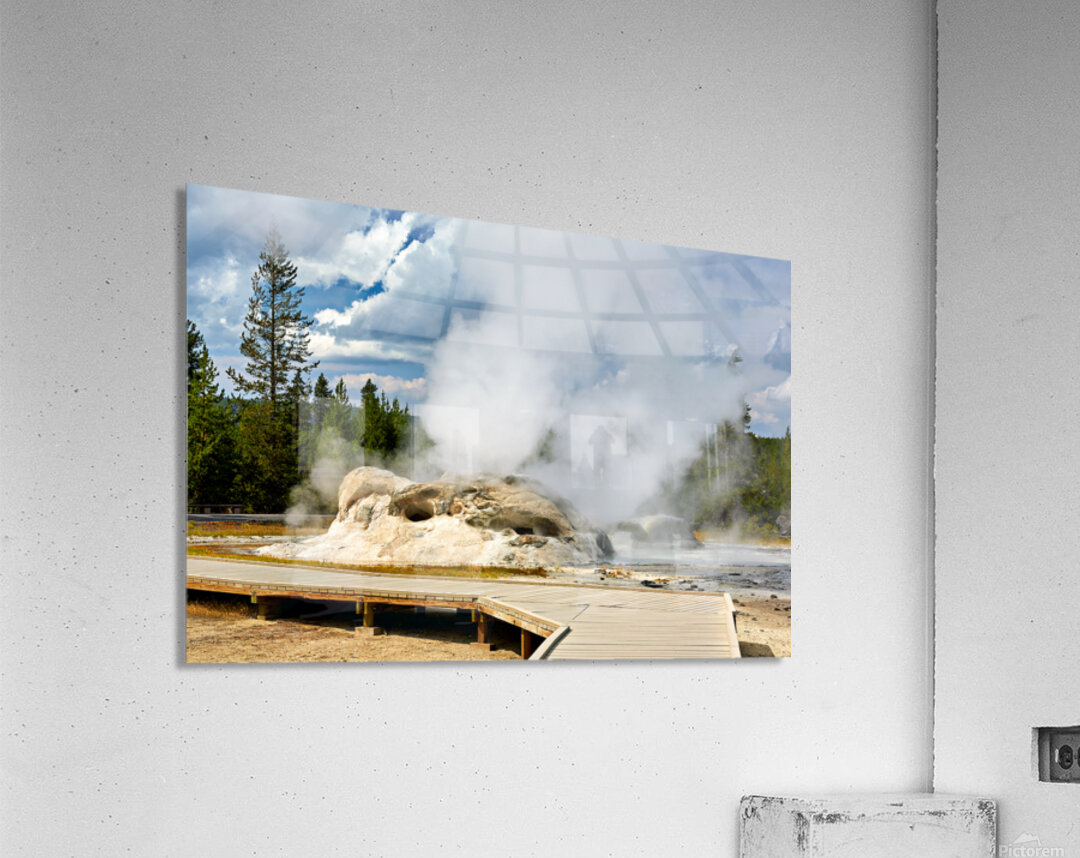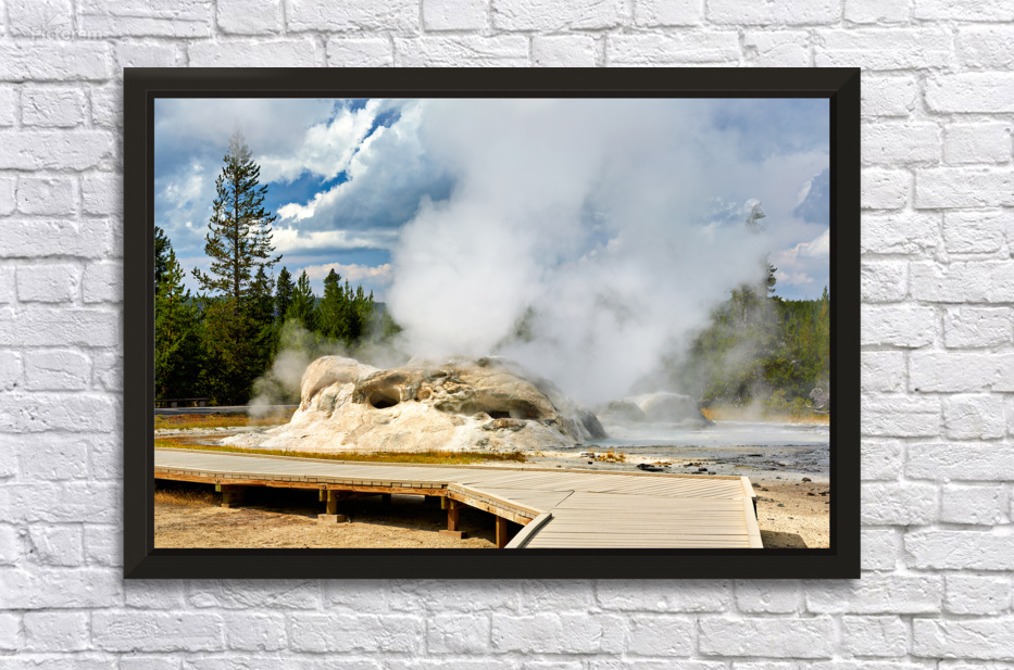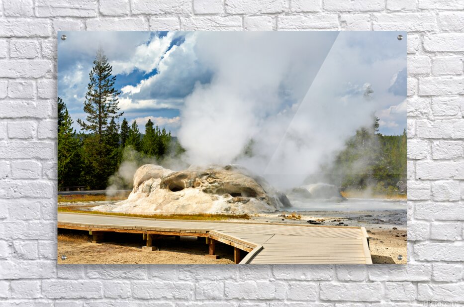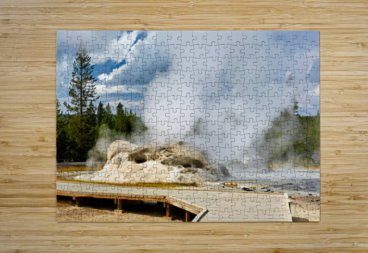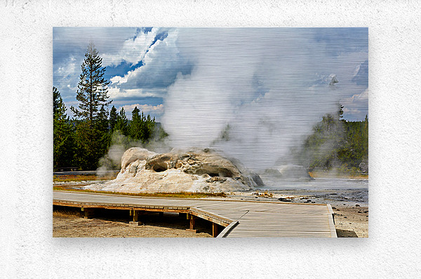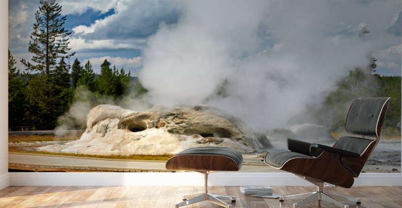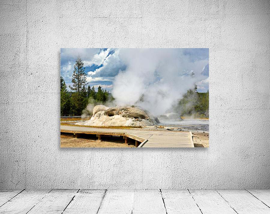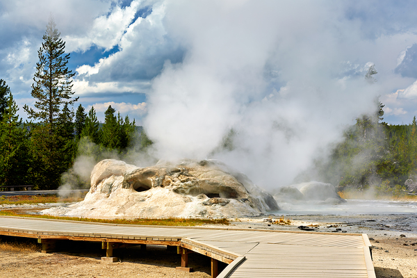 Grotto Geyser erupts with steam and water in Yellowstone National Park. Visitors can see the powerful nature in this active geothermal area.