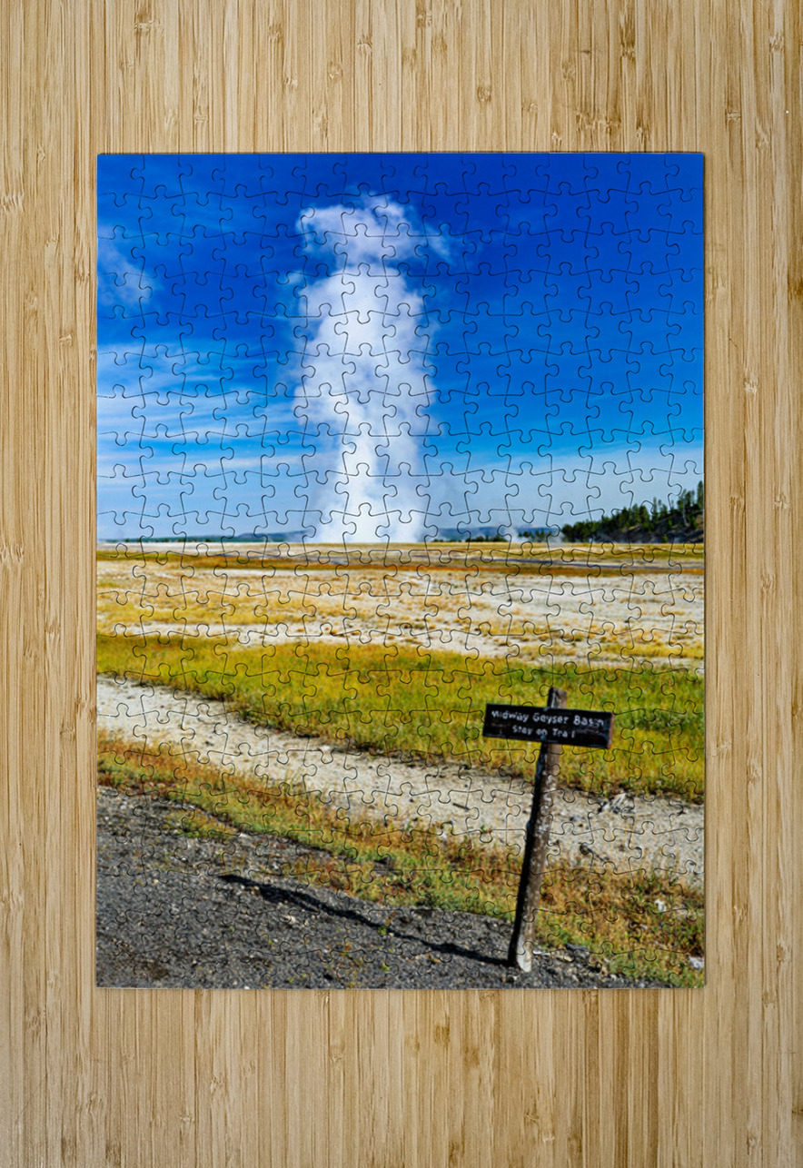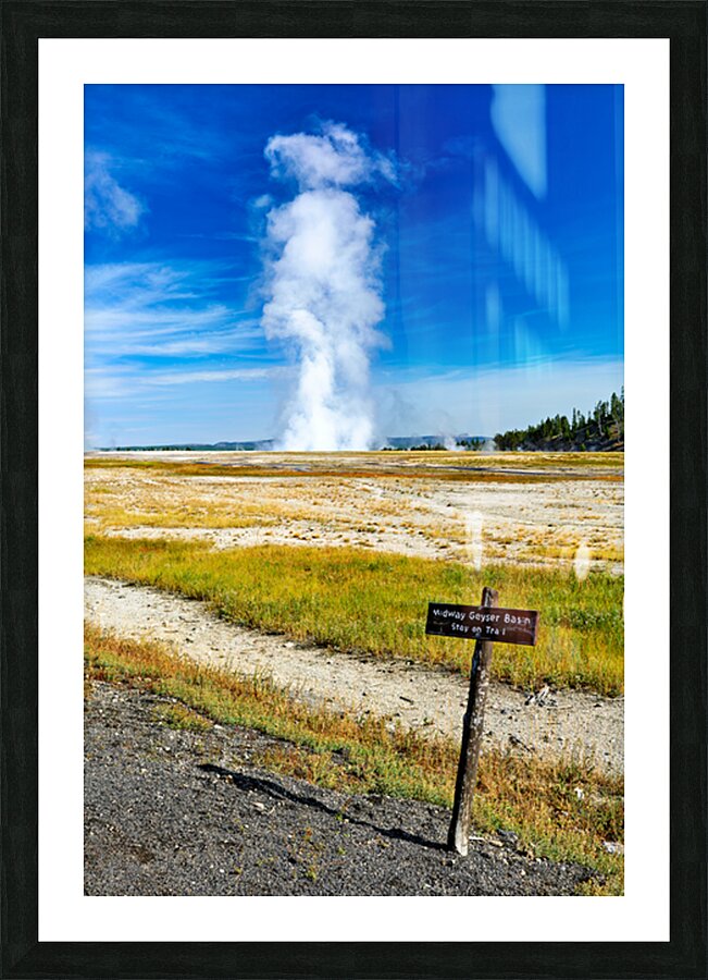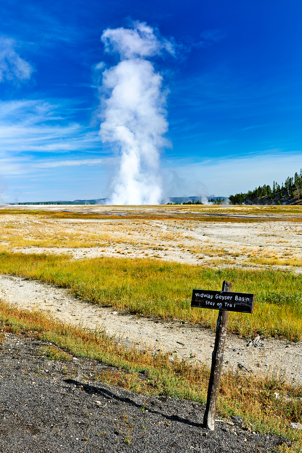 Steam rises from the geothermal features in Midway Geyser Basin at Yellowstone National Park during the day. Visitors watch from a distance.