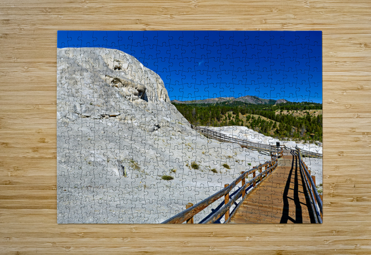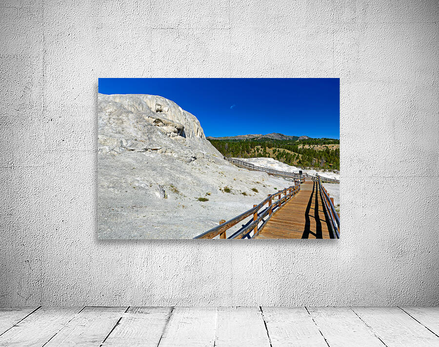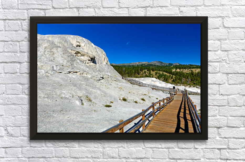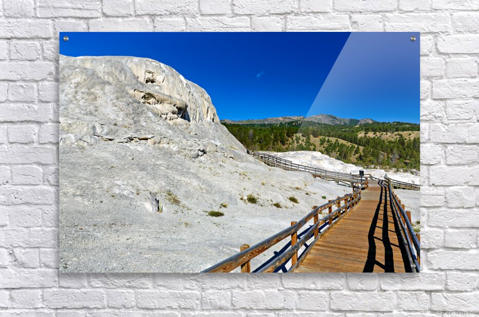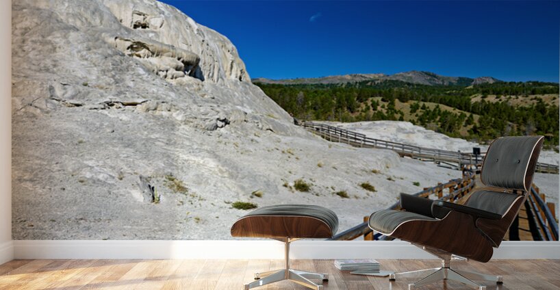 Visitors walk on a wooden path near Mound Spring and Jupiter Terrace in Yellowstone National Park. This location shows unique geothermal features.