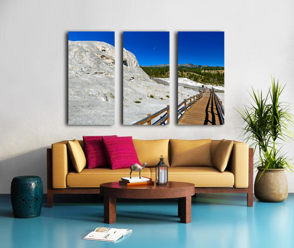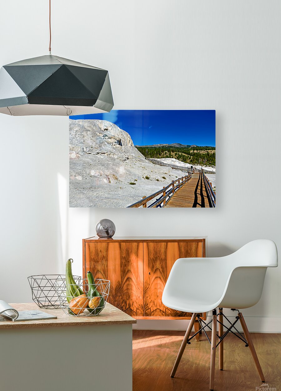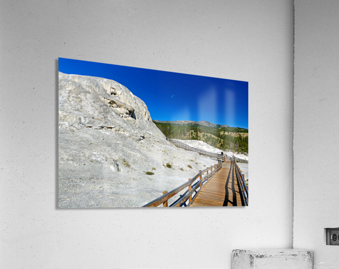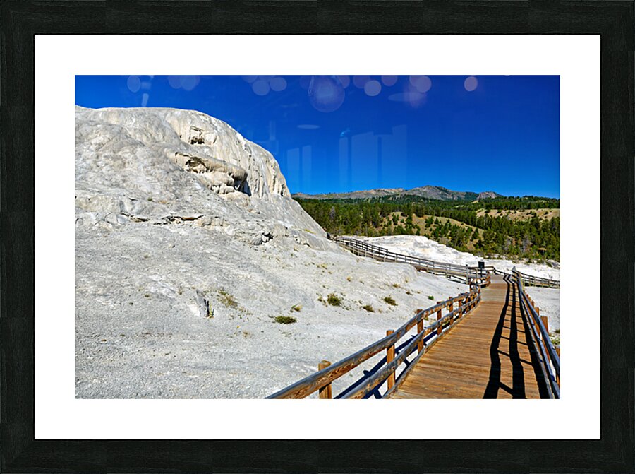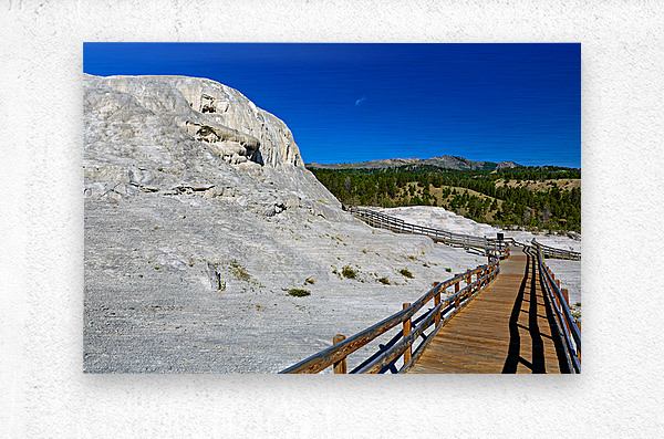 Visitors walk on a wooden path near Mound Spring and Jupiter Terrace in Yellowstone National Park. This location shows unique geothermal features.