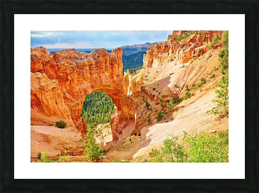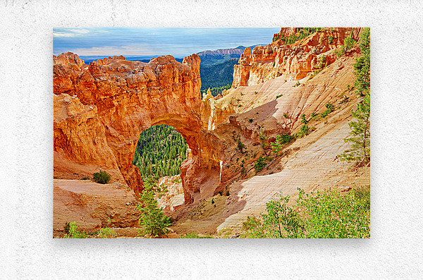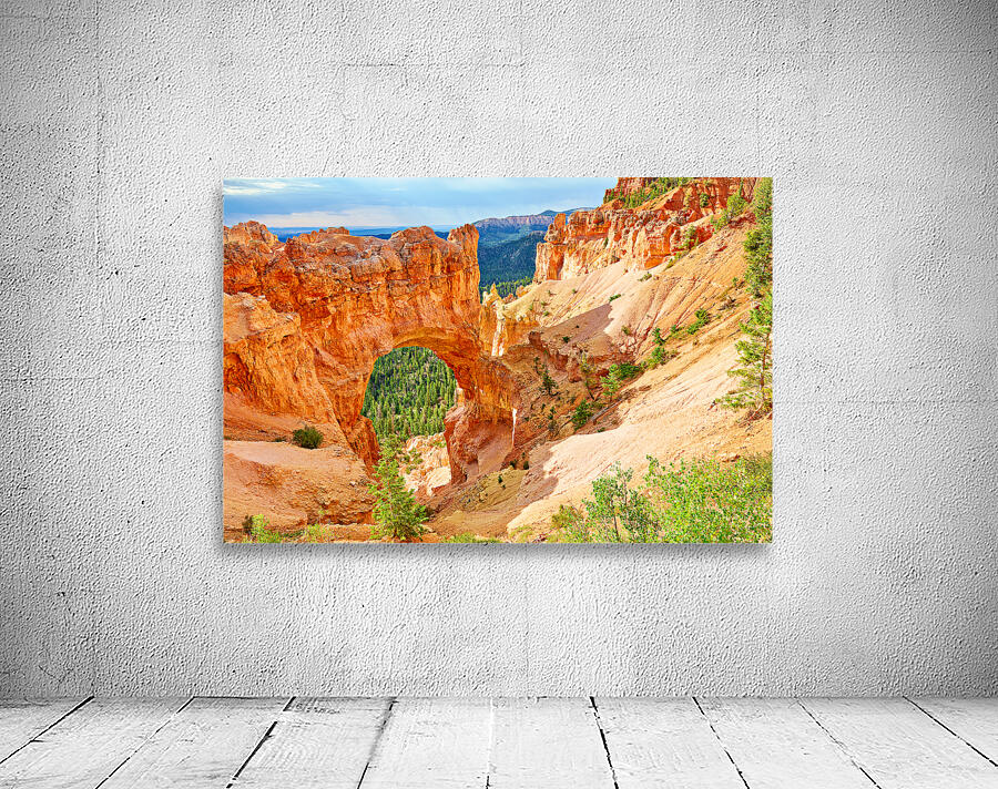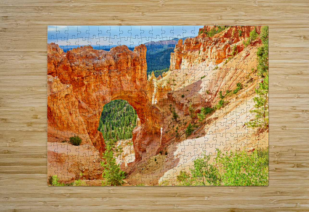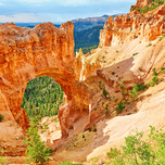 Visitors explore the natural bridge in Bryce Canyon National Park. The rocky landscape shows layers of stone and green trees in the background.