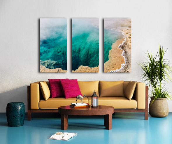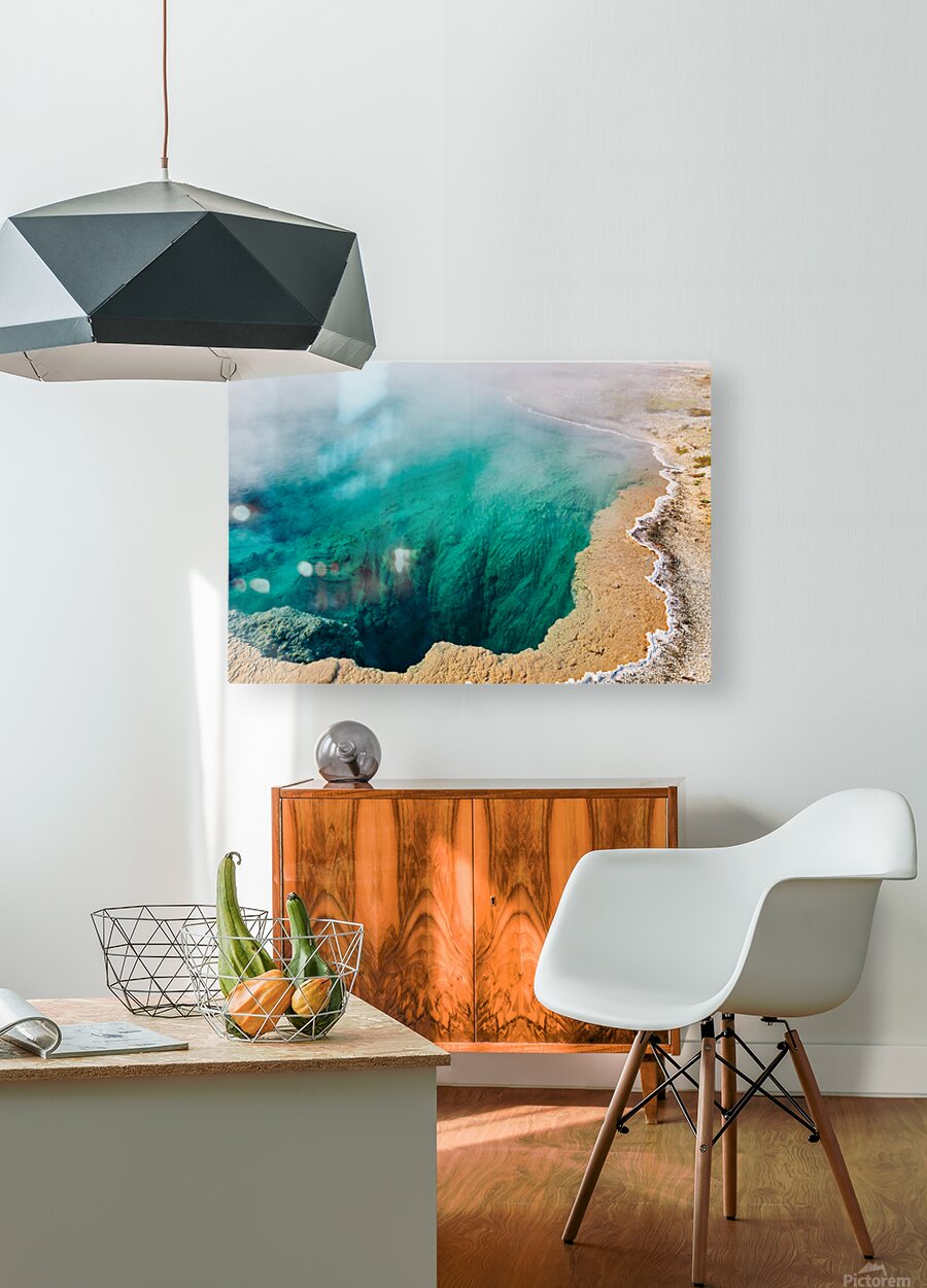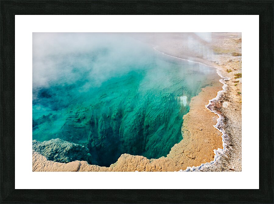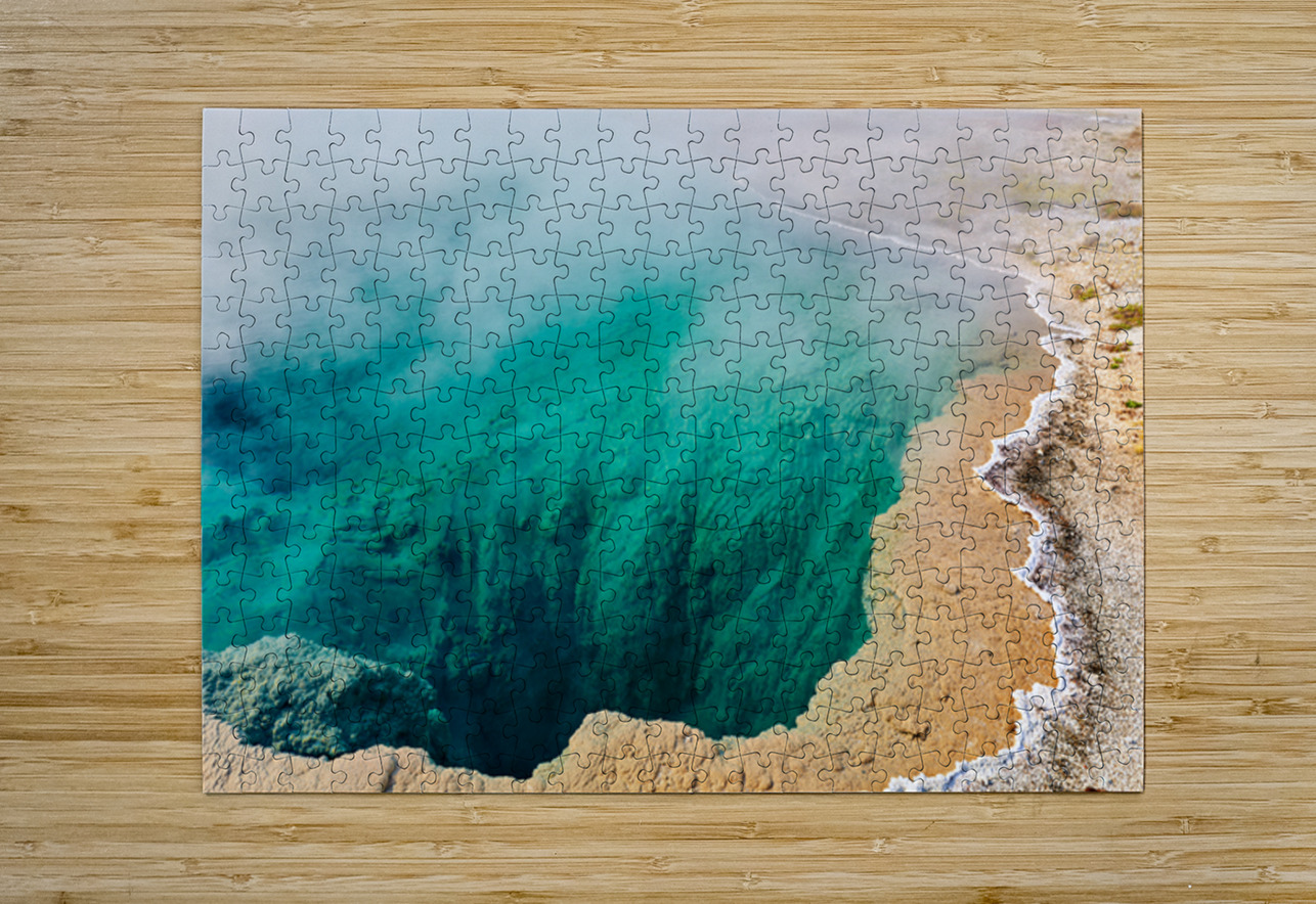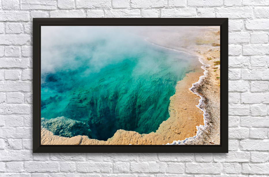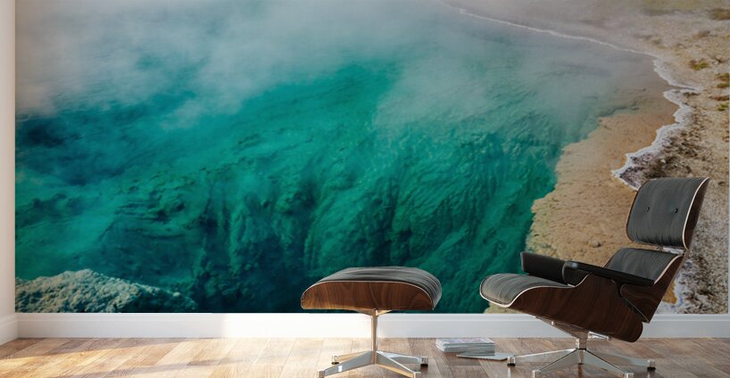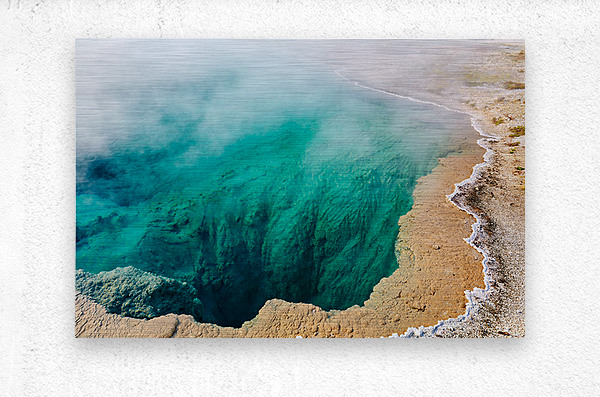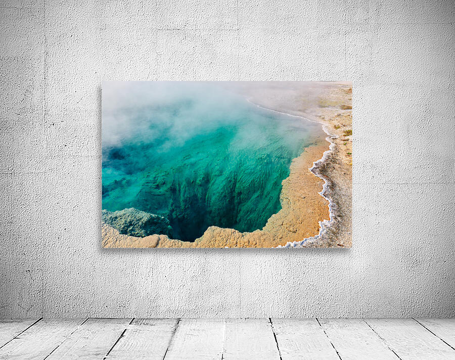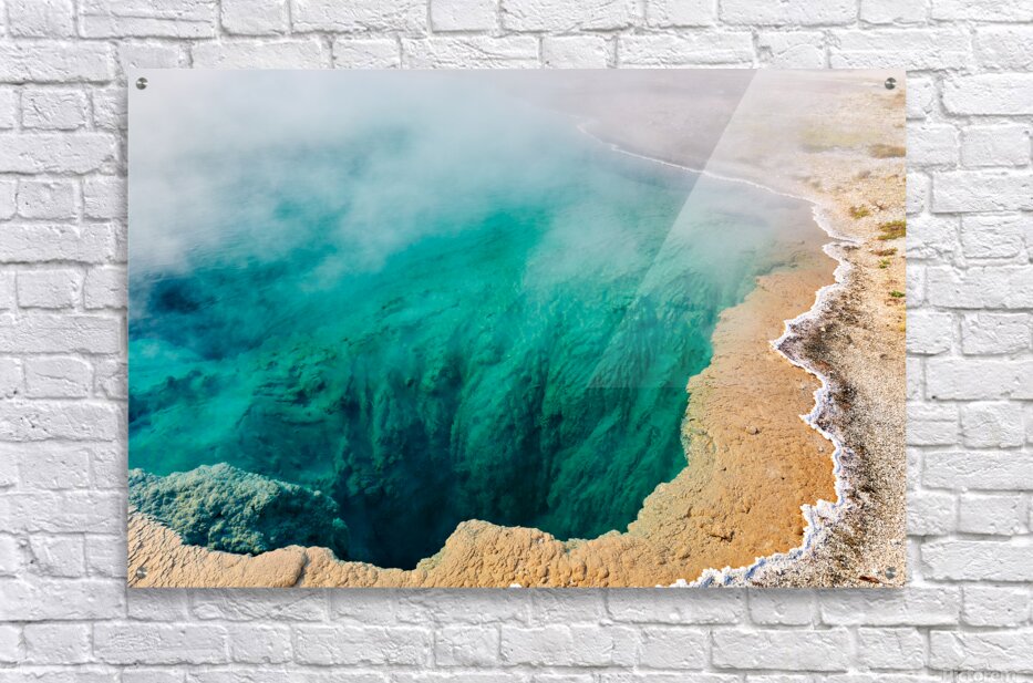 Water fills Abyss Pool at Yellowstone National Park. Steam rises from the surface in a bubbling geothermal hot spring.