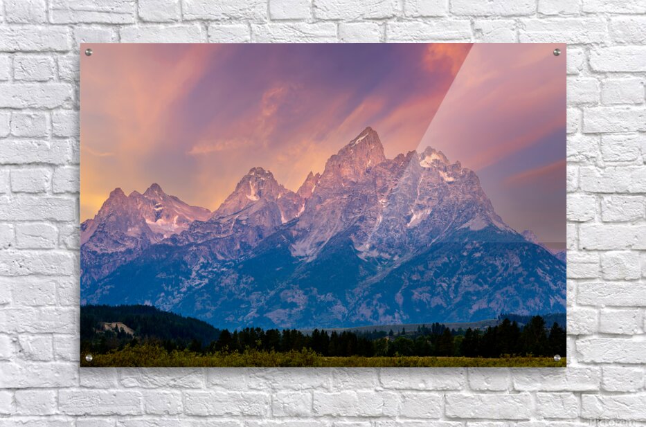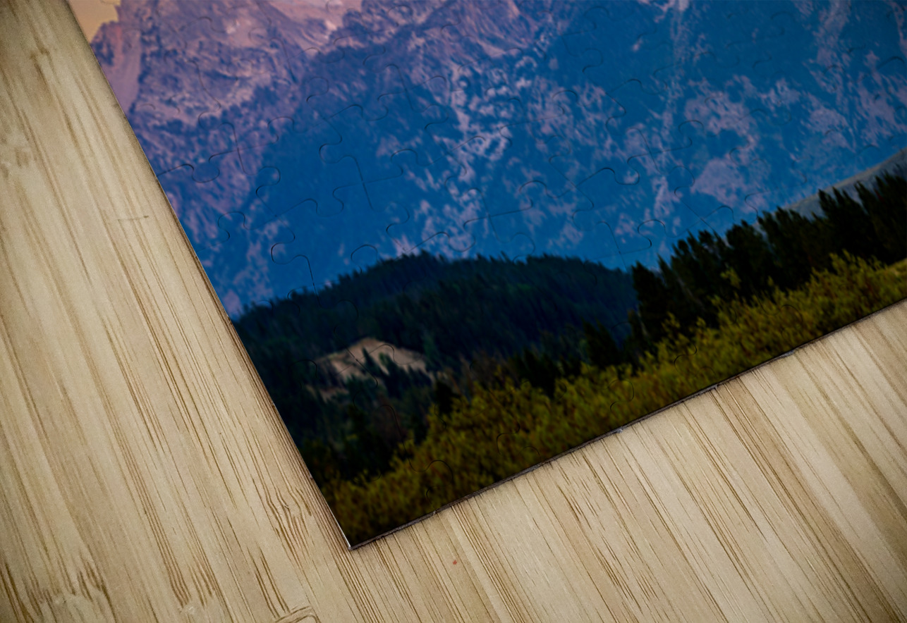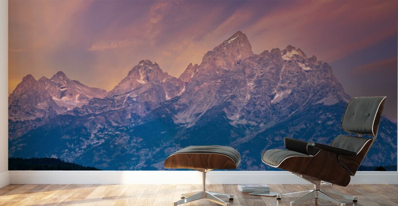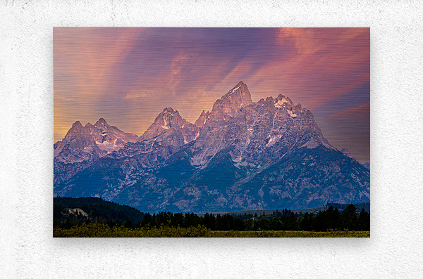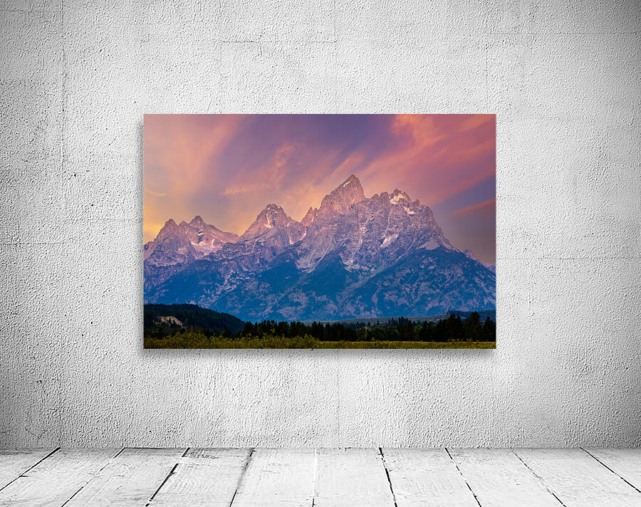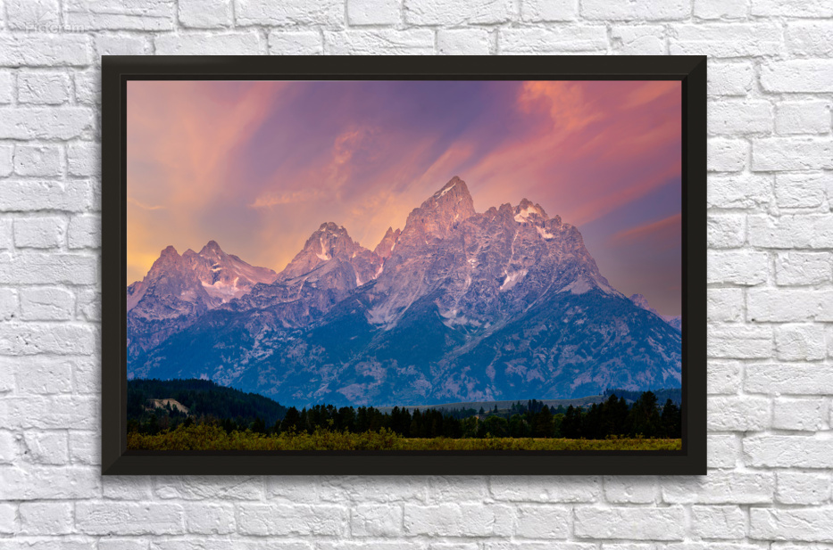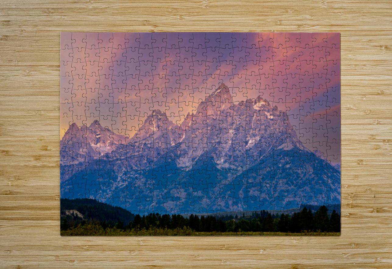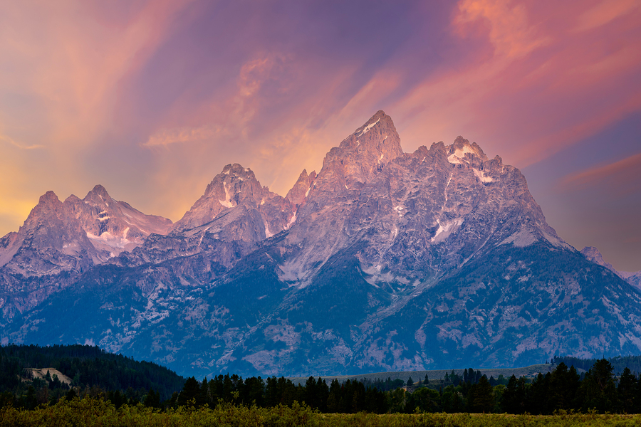 Grand Teton National Park shows tall peaks at dusk. The colors change as the sun sets behind the mountains in the sky.