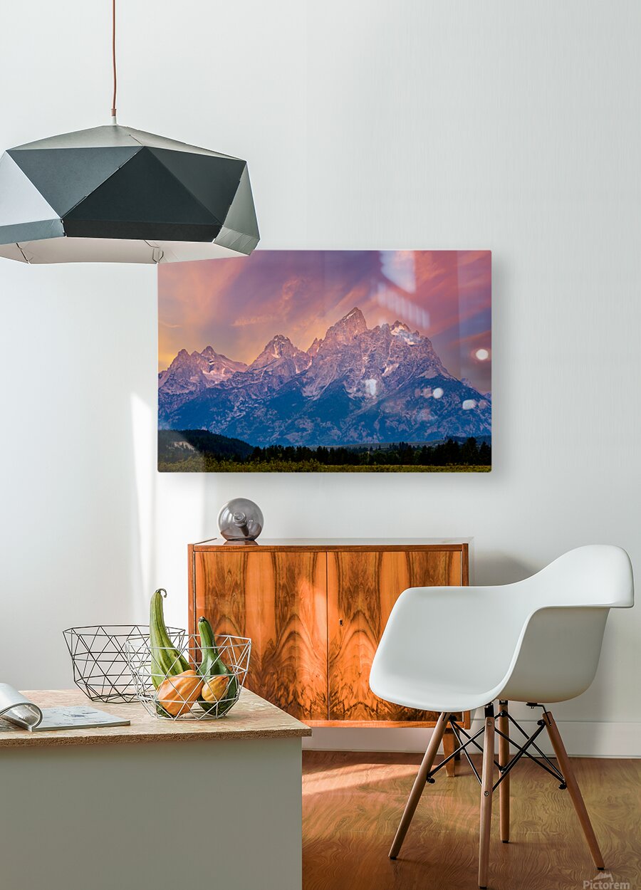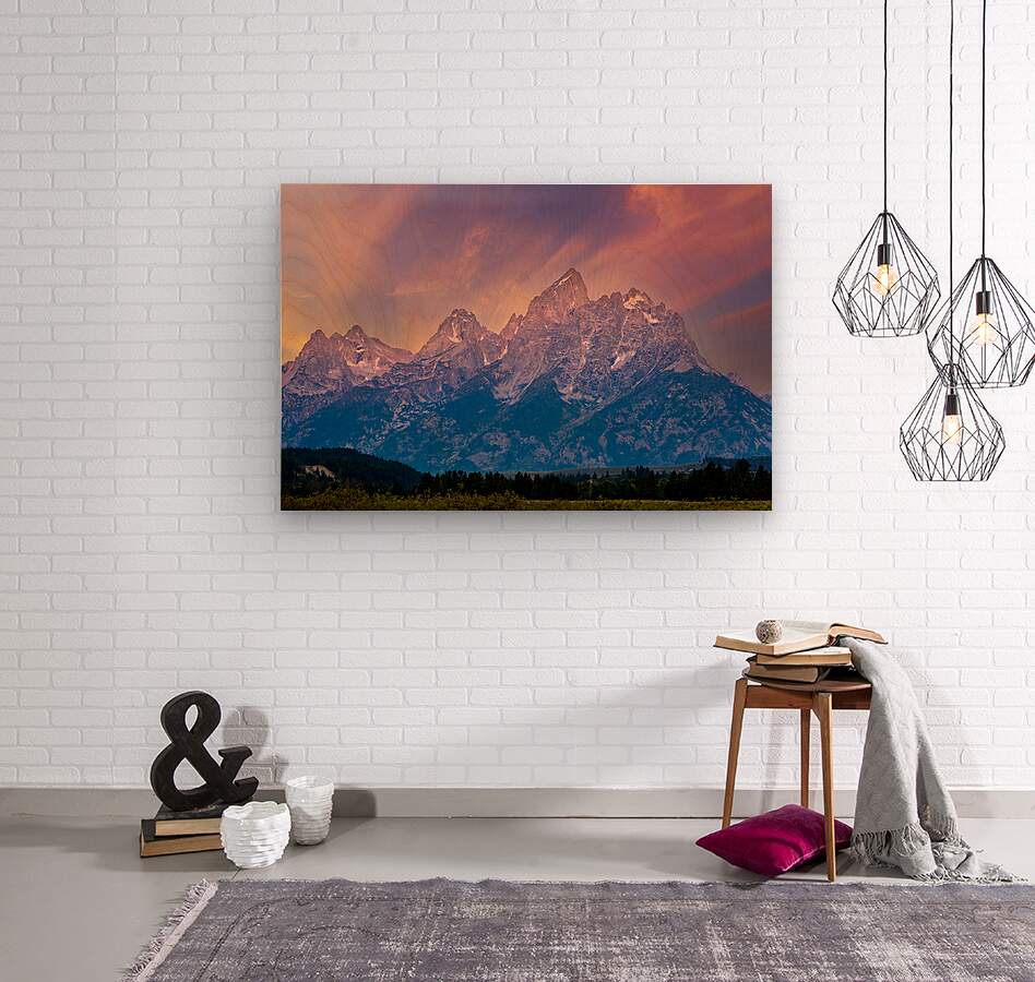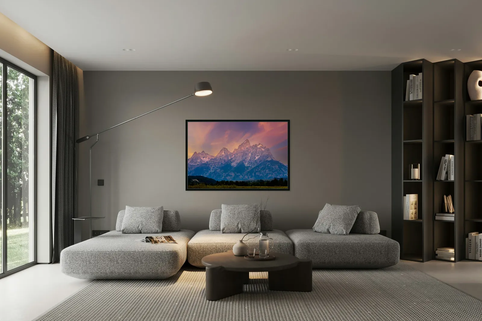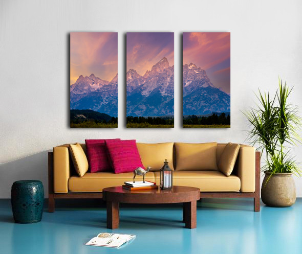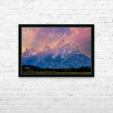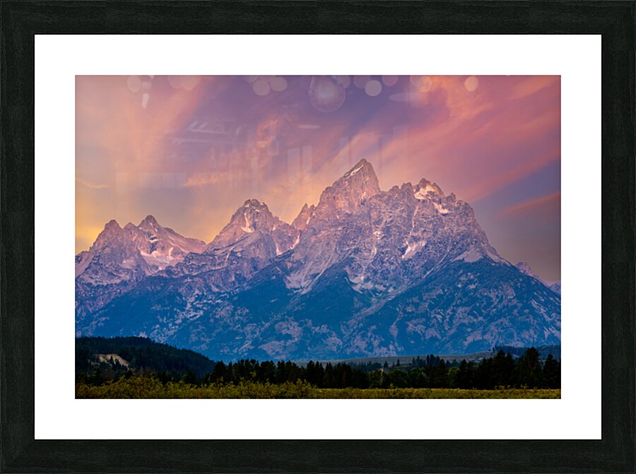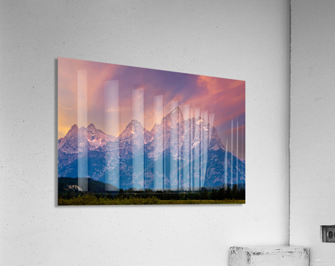 Grand Teton National Park shows tall peaks at dusk. The colors change as the sun sets behind the mountains in the sky.