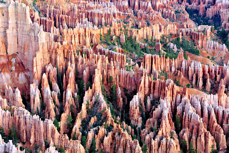Visitors observe unique rock formations at Bryce Point during sunrise. The colors of the rocks change as the sun rises over the horizon.