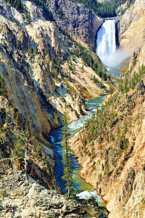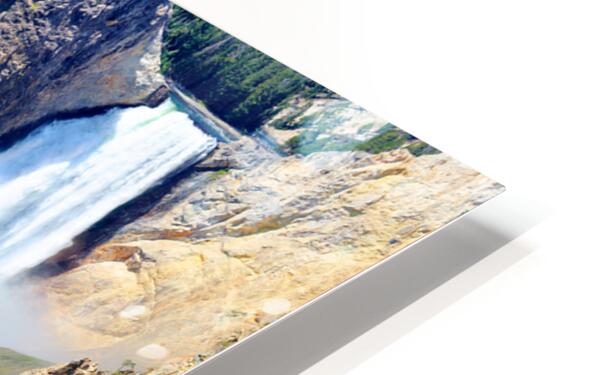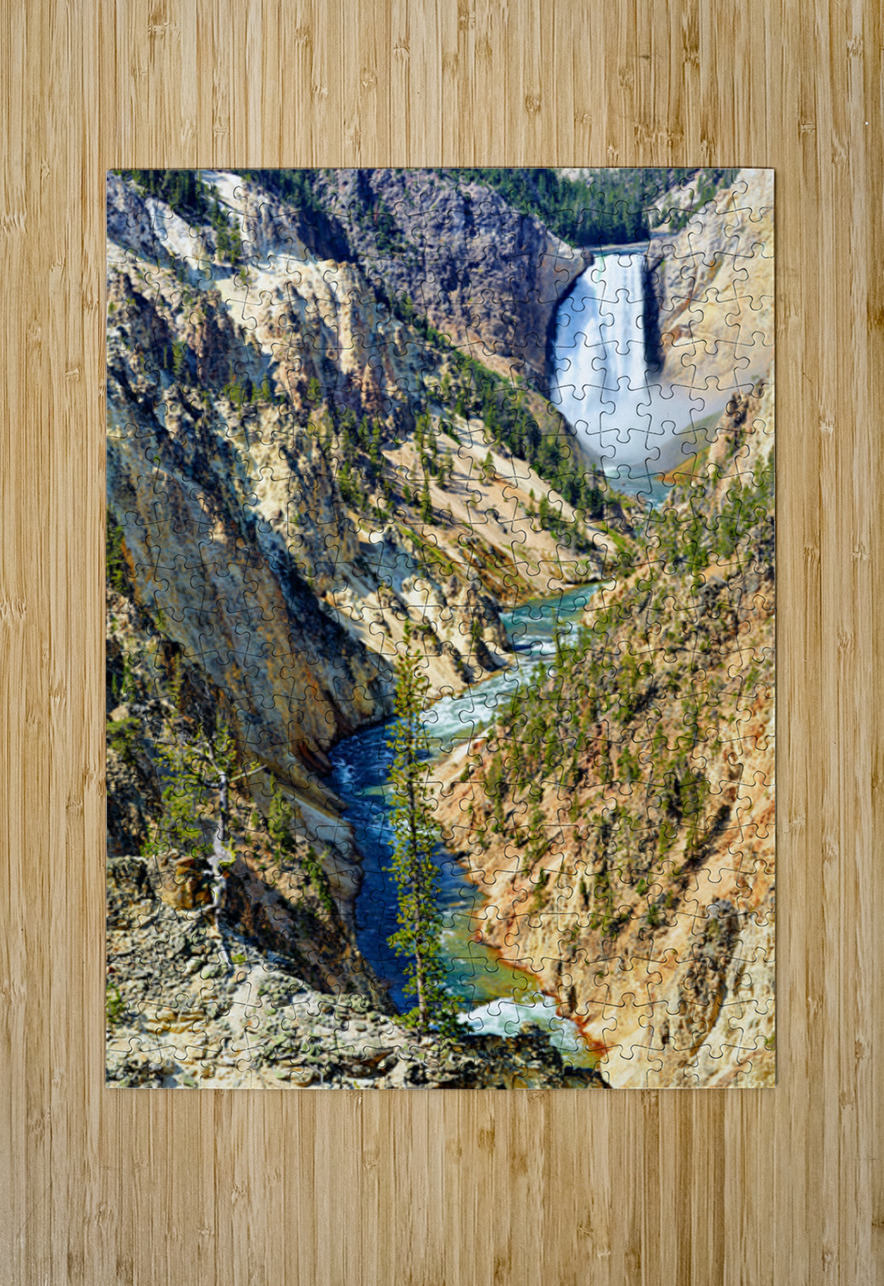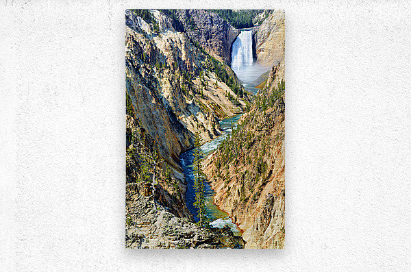 A waterfall flows down into the canyon while a river winds through the landscape. Tall trees are seen along the rocky cliffs and hills.