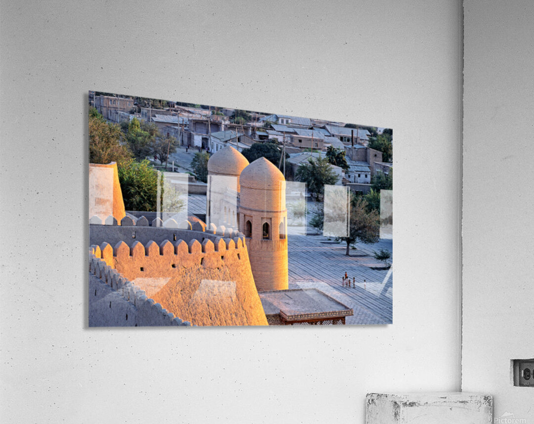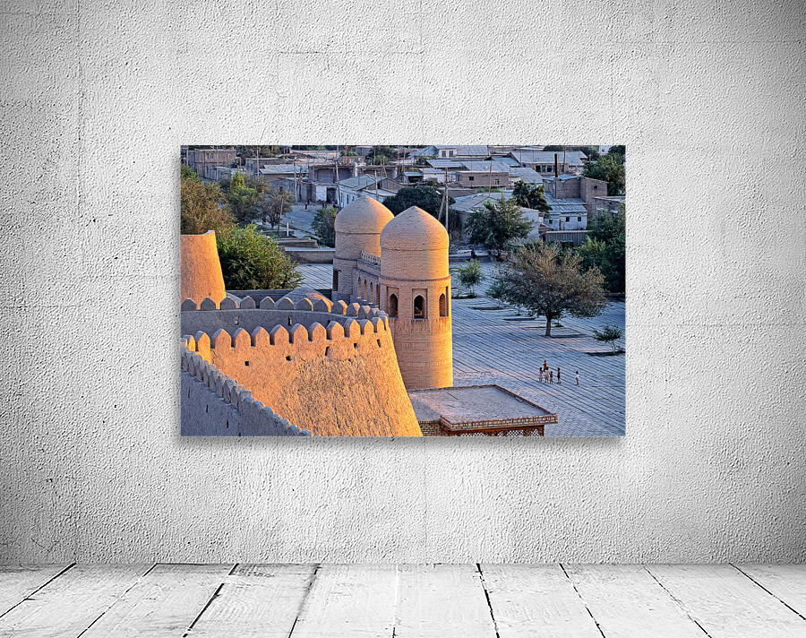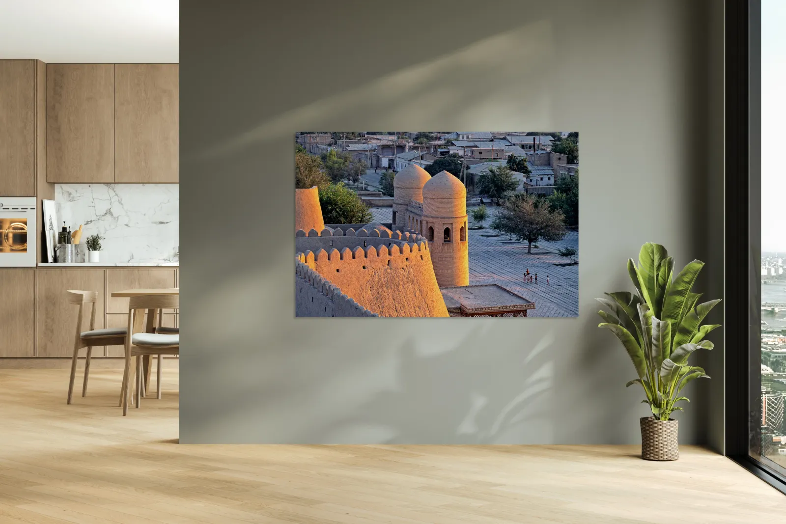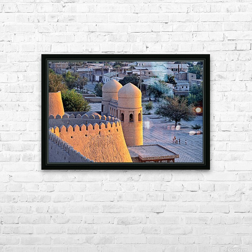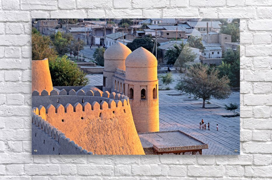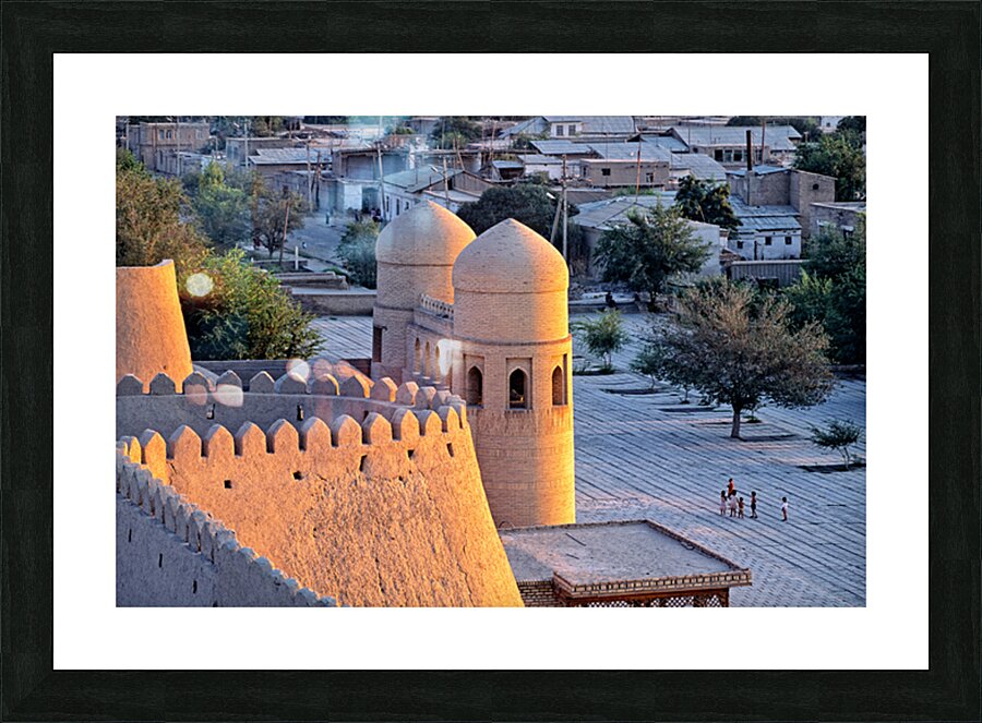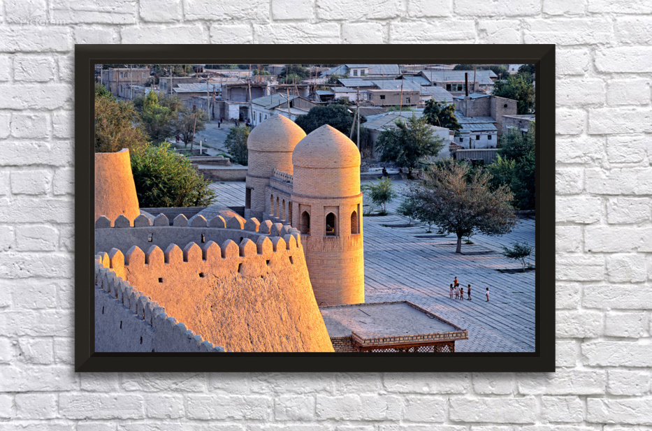 "View of Khiva in Uzbekistan with historic buildings and people" in a framed print.
