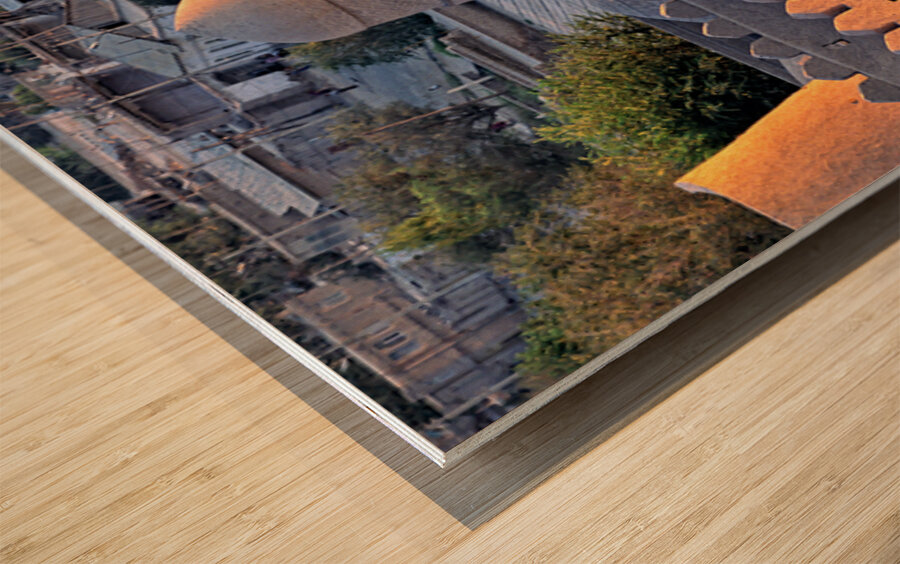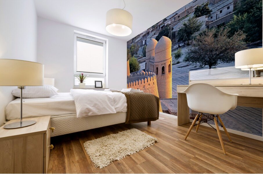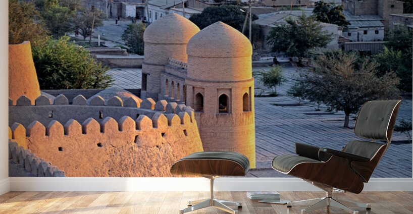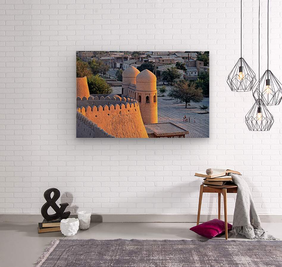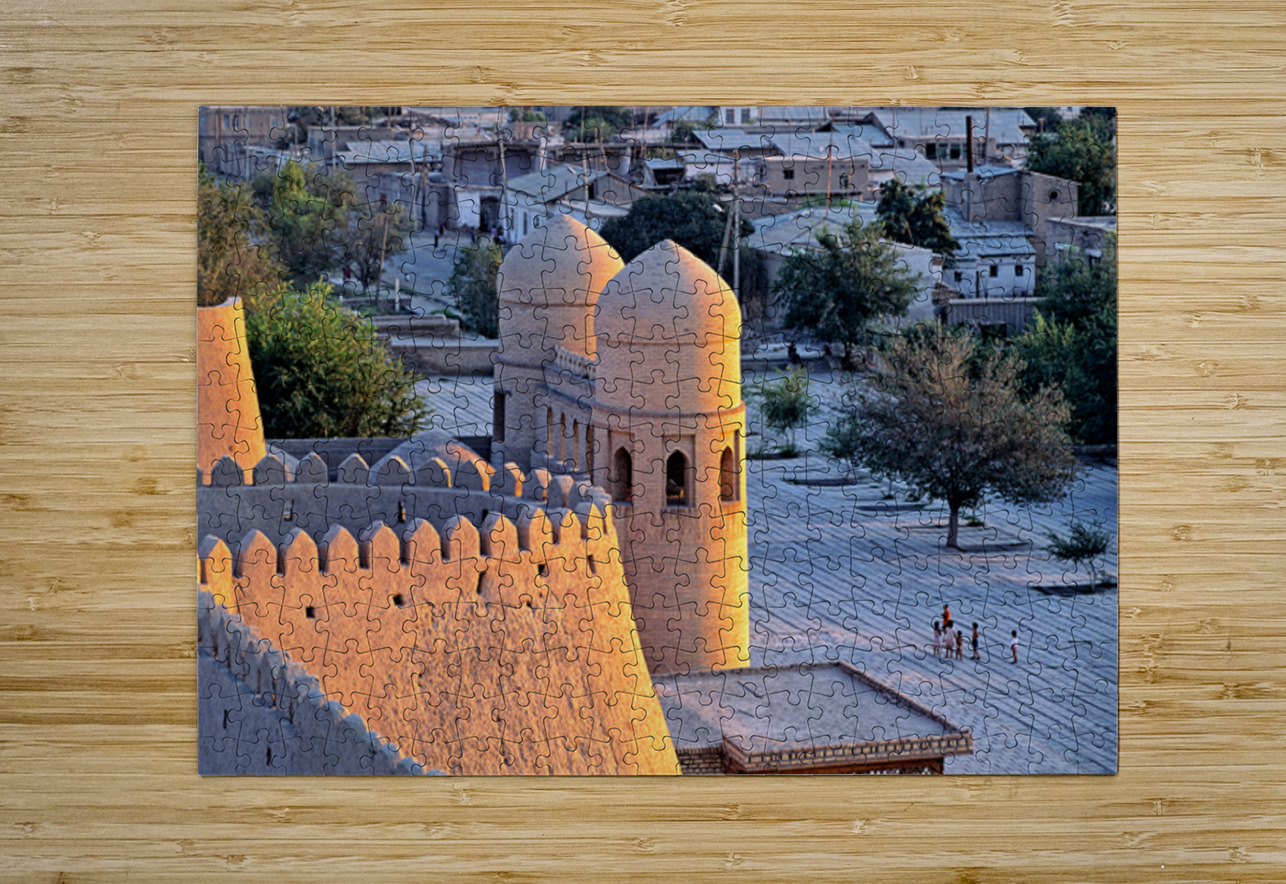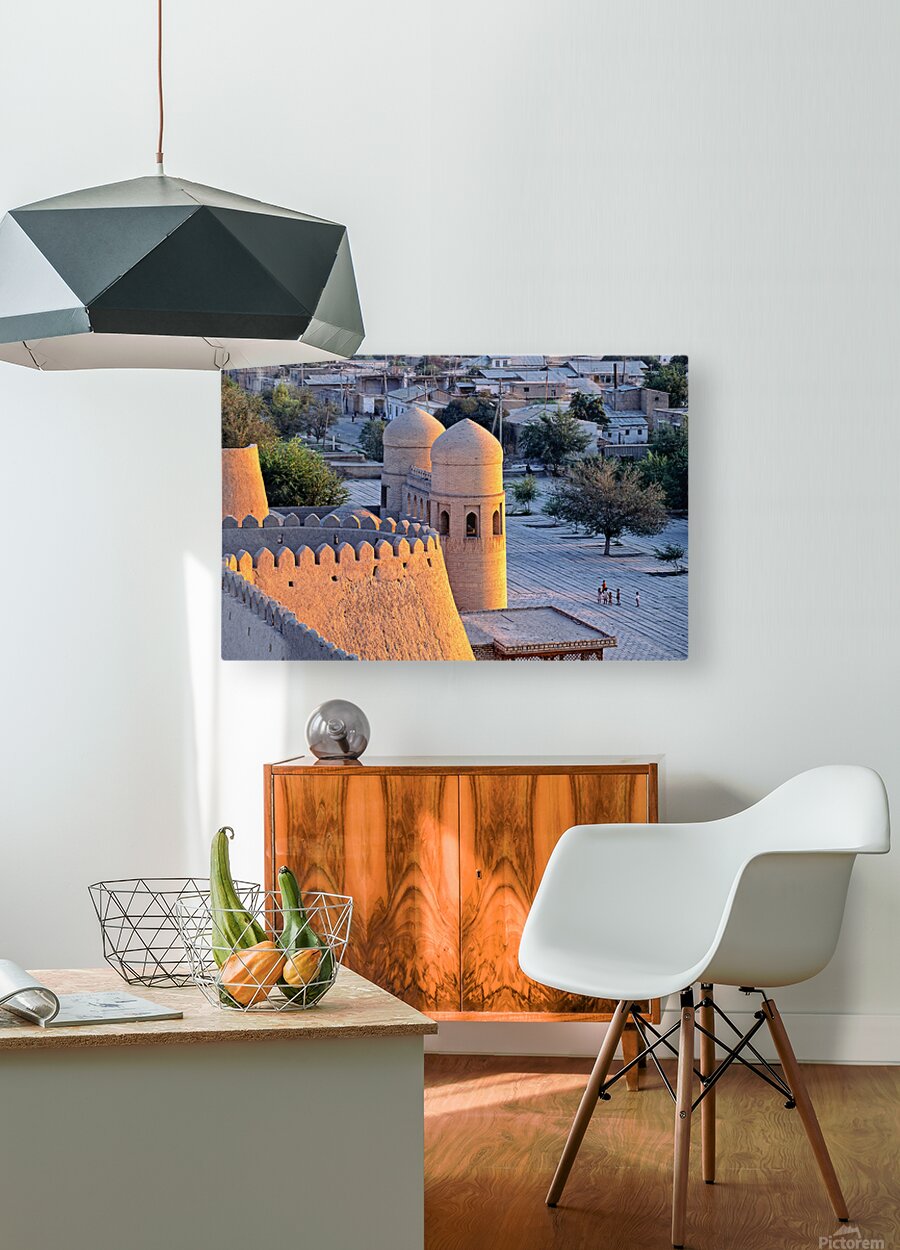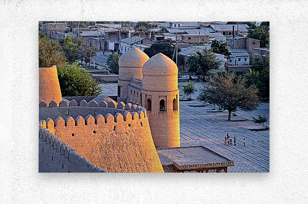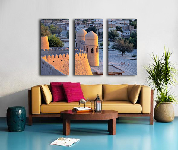 "View of Khiva in Uzbekistan with historic buildings and people" in a framed print.