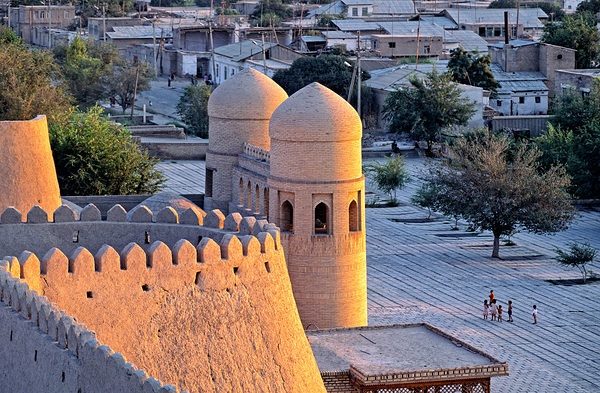 People walk near old buildings in Khiva Uzbekistan. The sun sets over the walls and towers of this historic city.