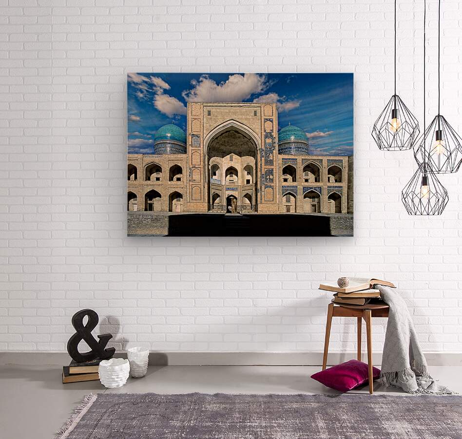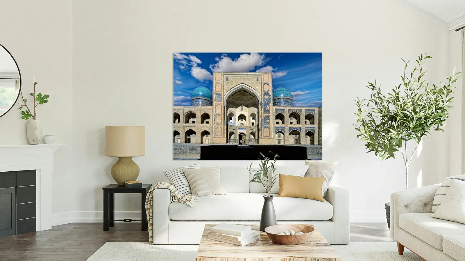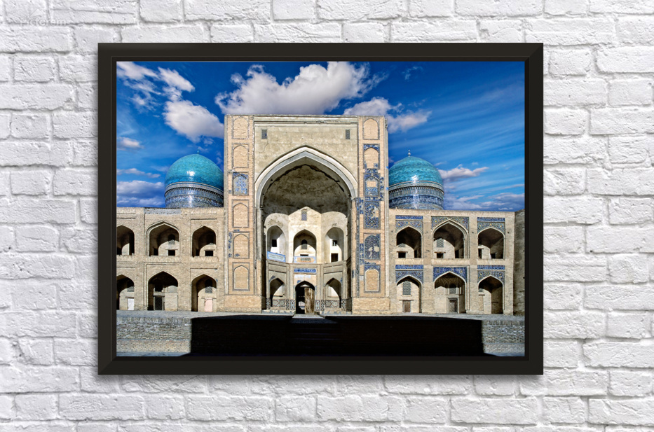 Visitors explore the historic site with blue domes and intricate designs in Bukhara Uzbekistan on a clear day.