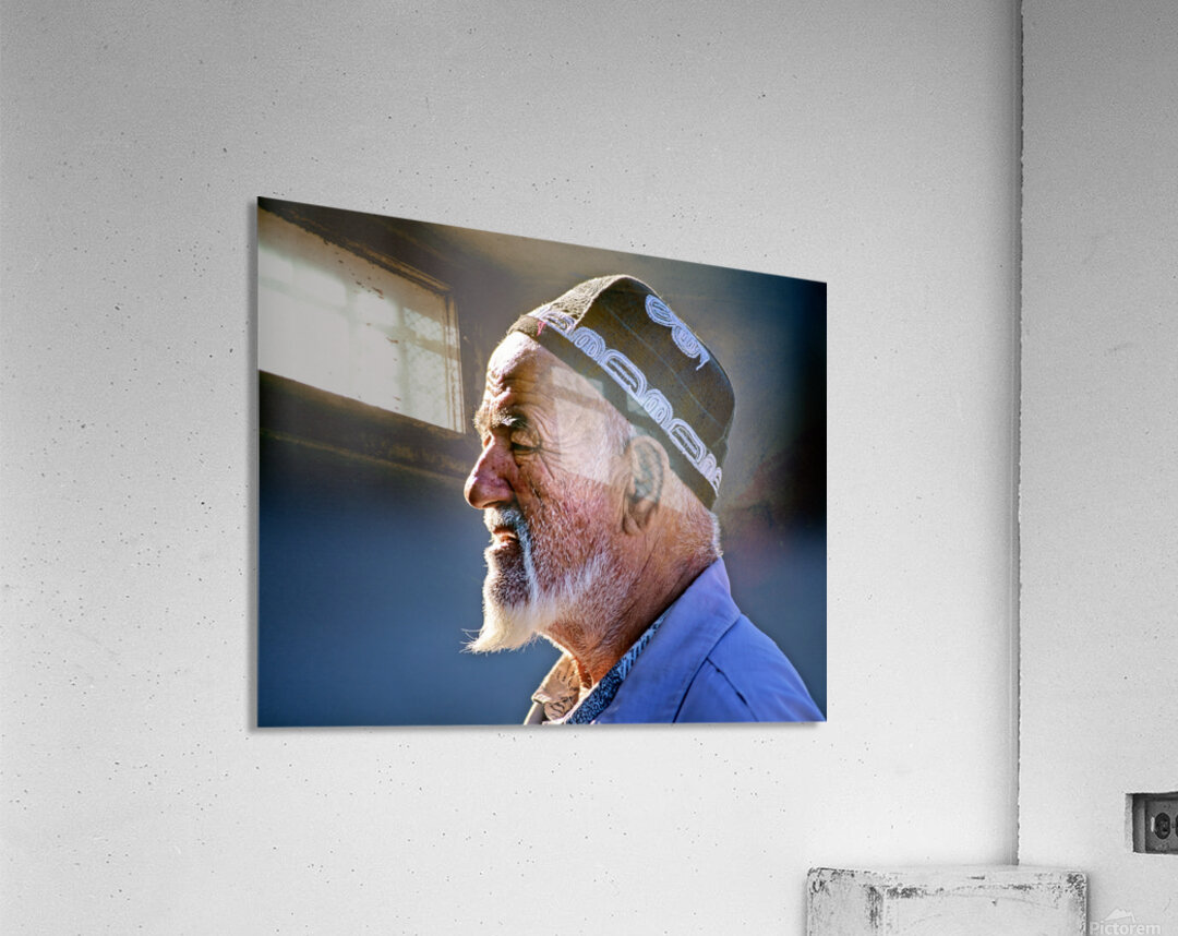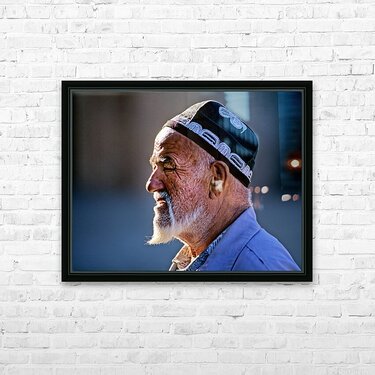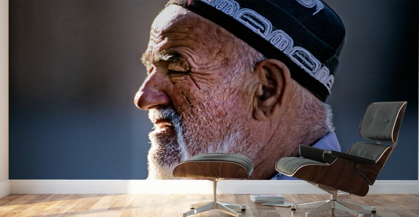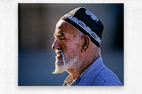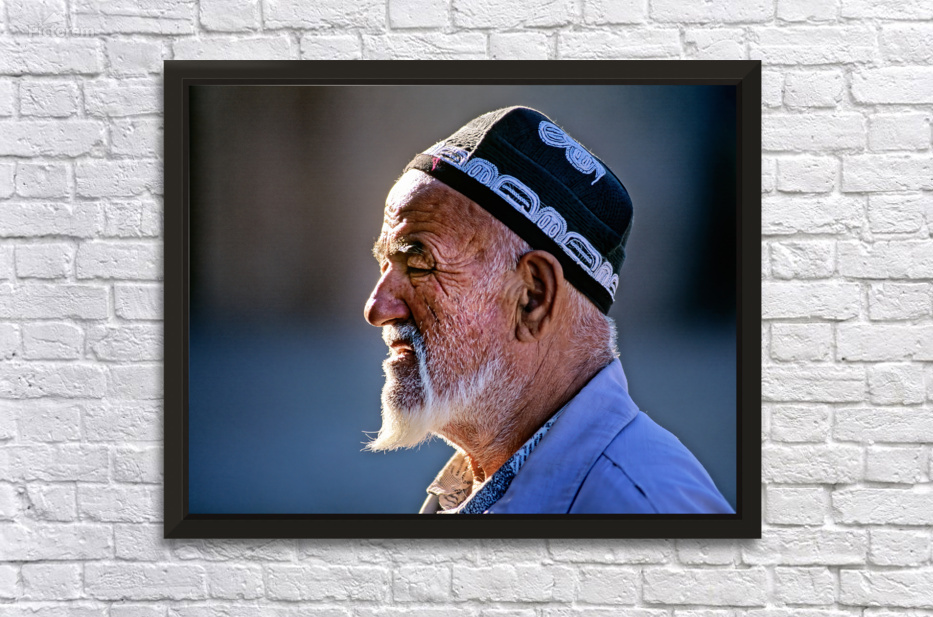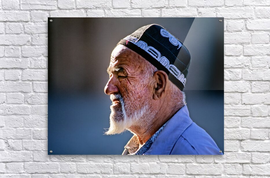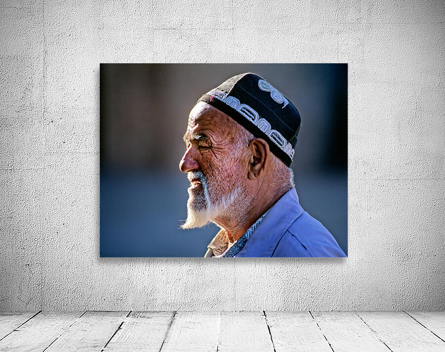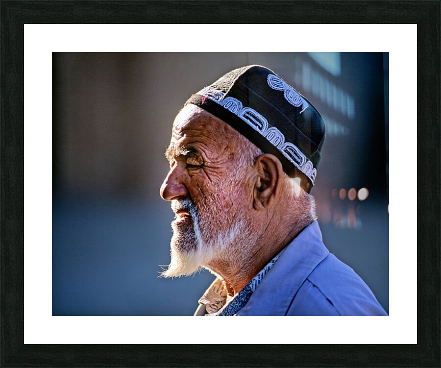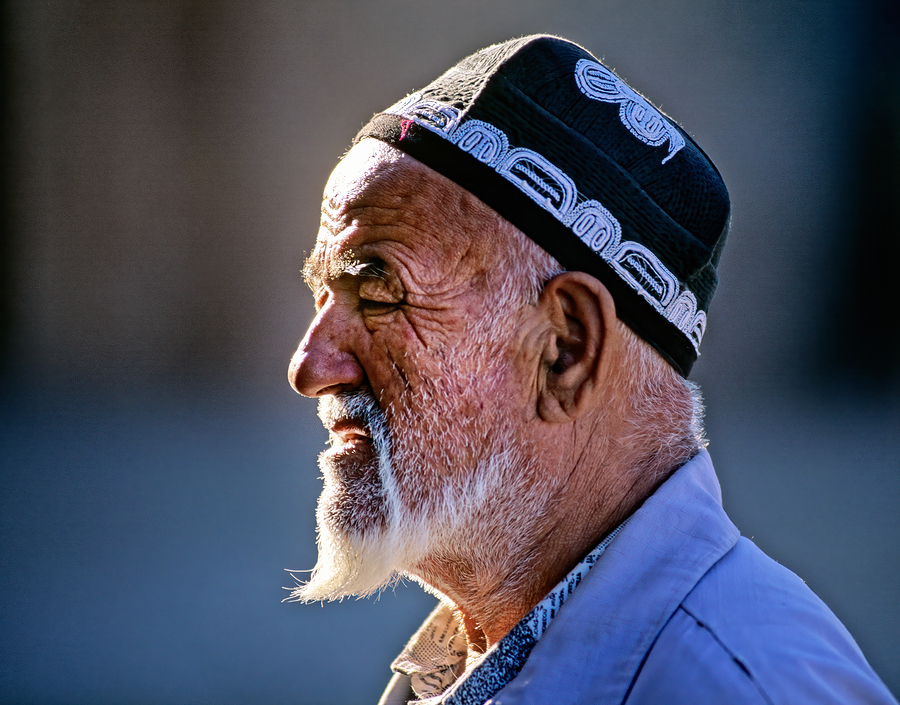 An elderly man walks in Khiva Uzbekistan with traditional clothing. His face shows signs of age and experience in the sunny light.