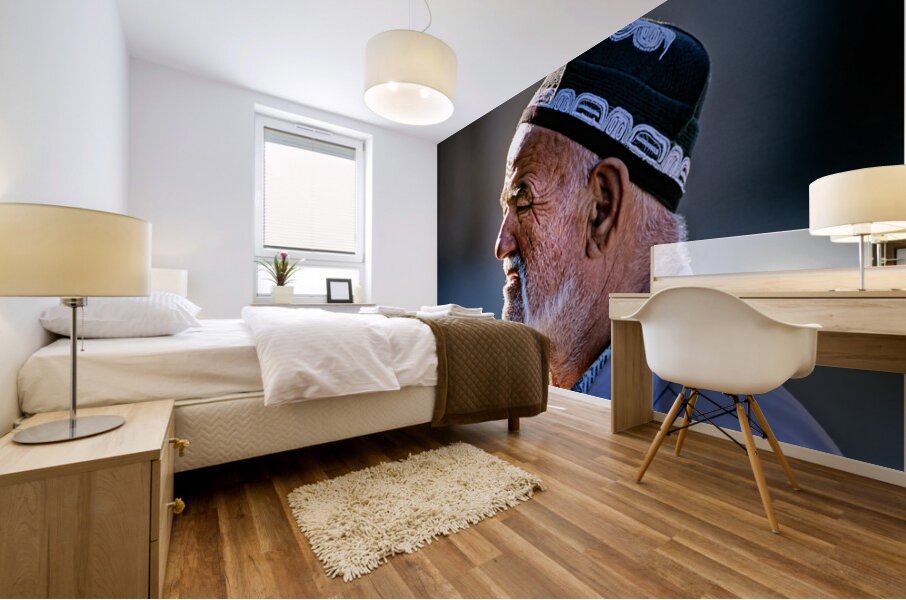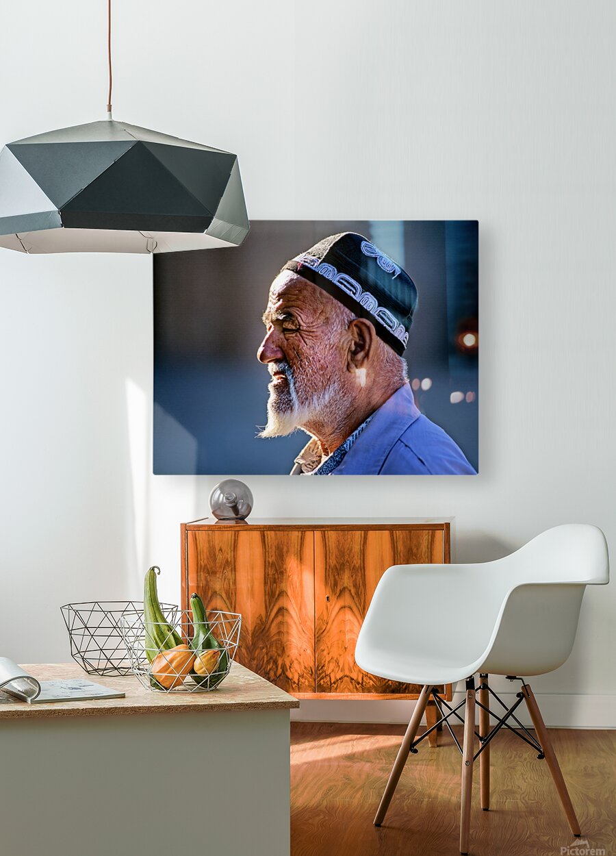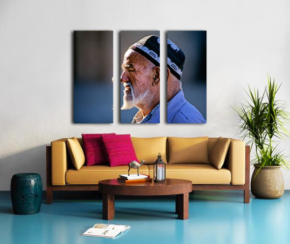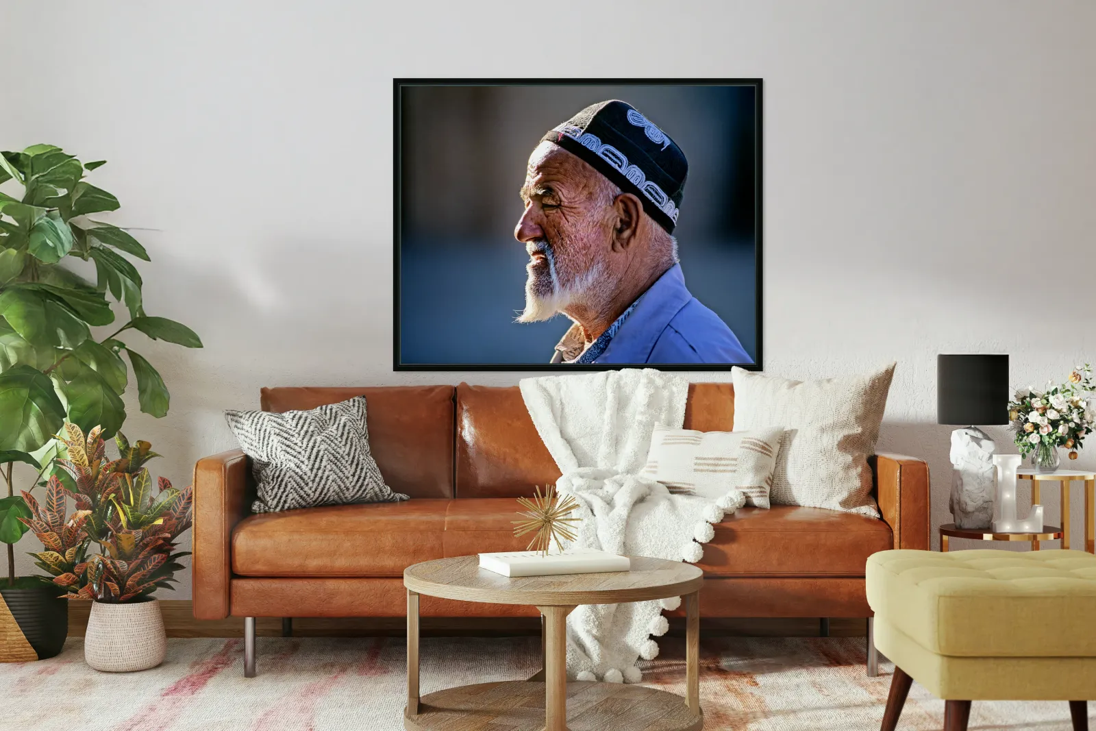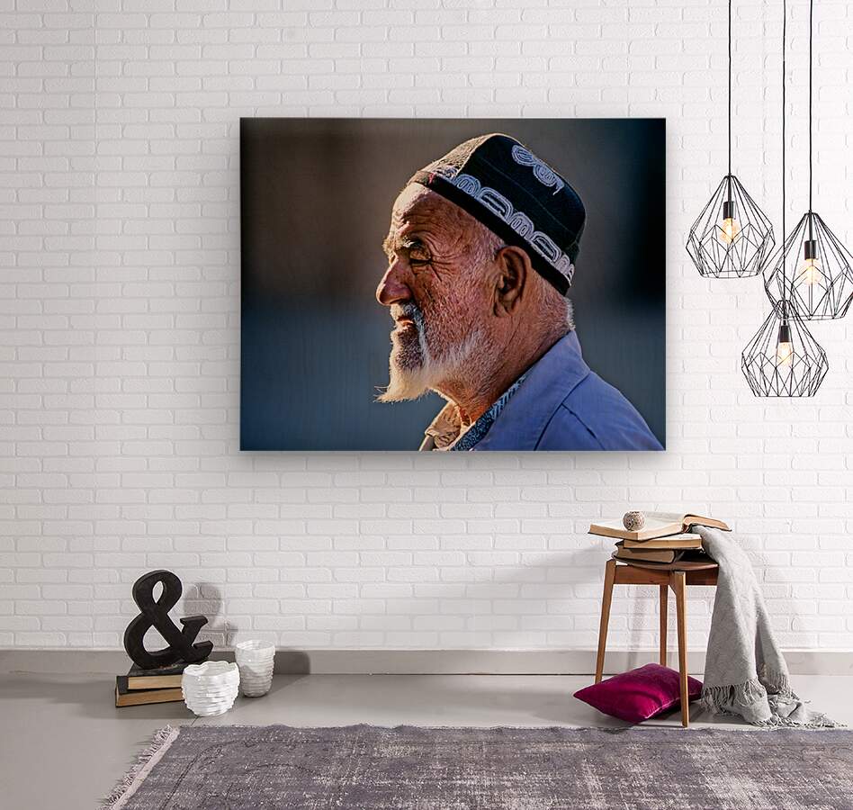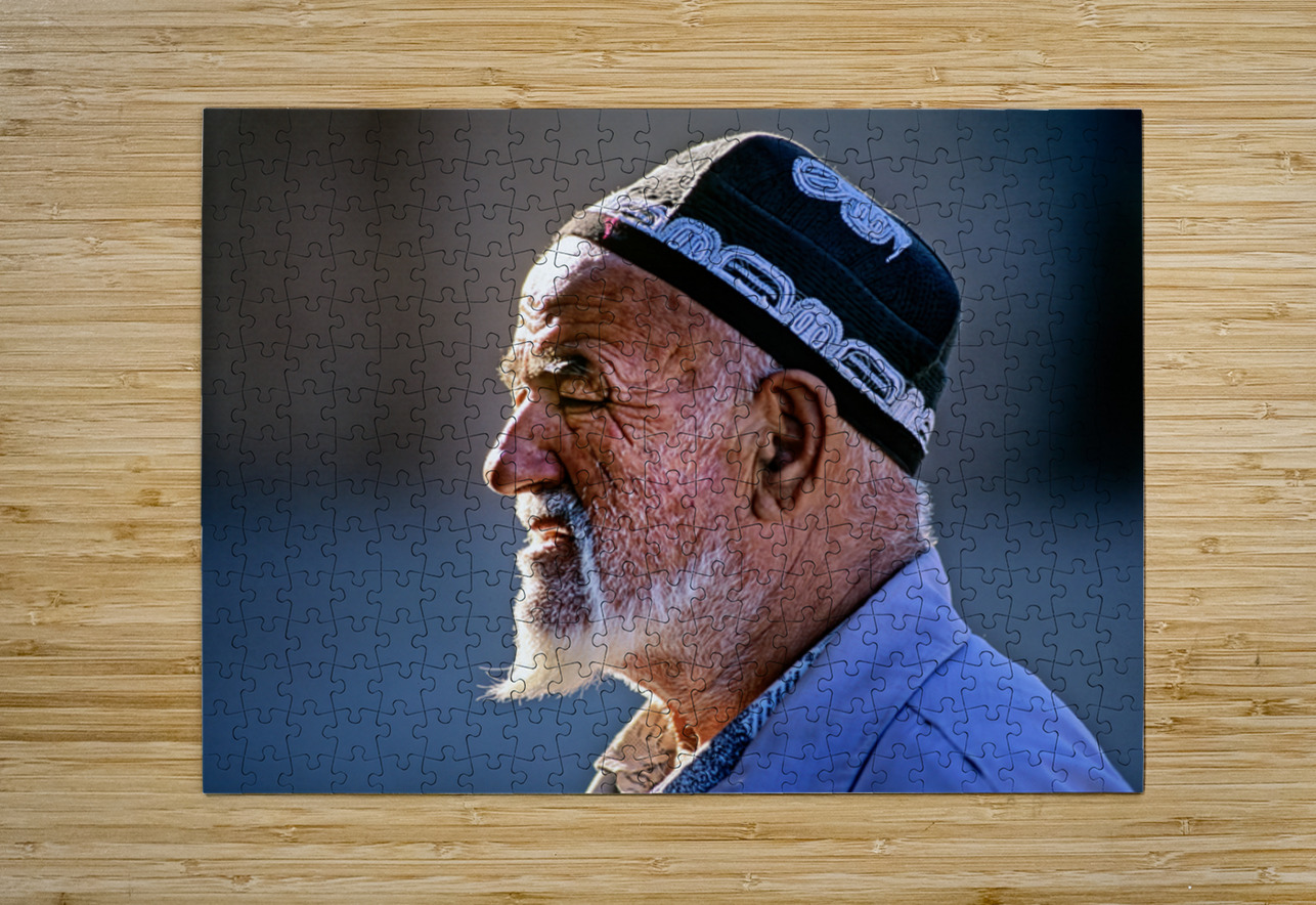 An elderly man walks in Khiva Uzbekistan with traditional clothing. His face shows signs of age and experience in the sunny light.