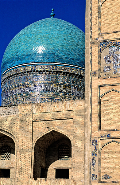 The blue dome stands tall over the mosque in Bukhara Uzbekistan. Visitors admire the detailed tiles and architecture in the sunlight.