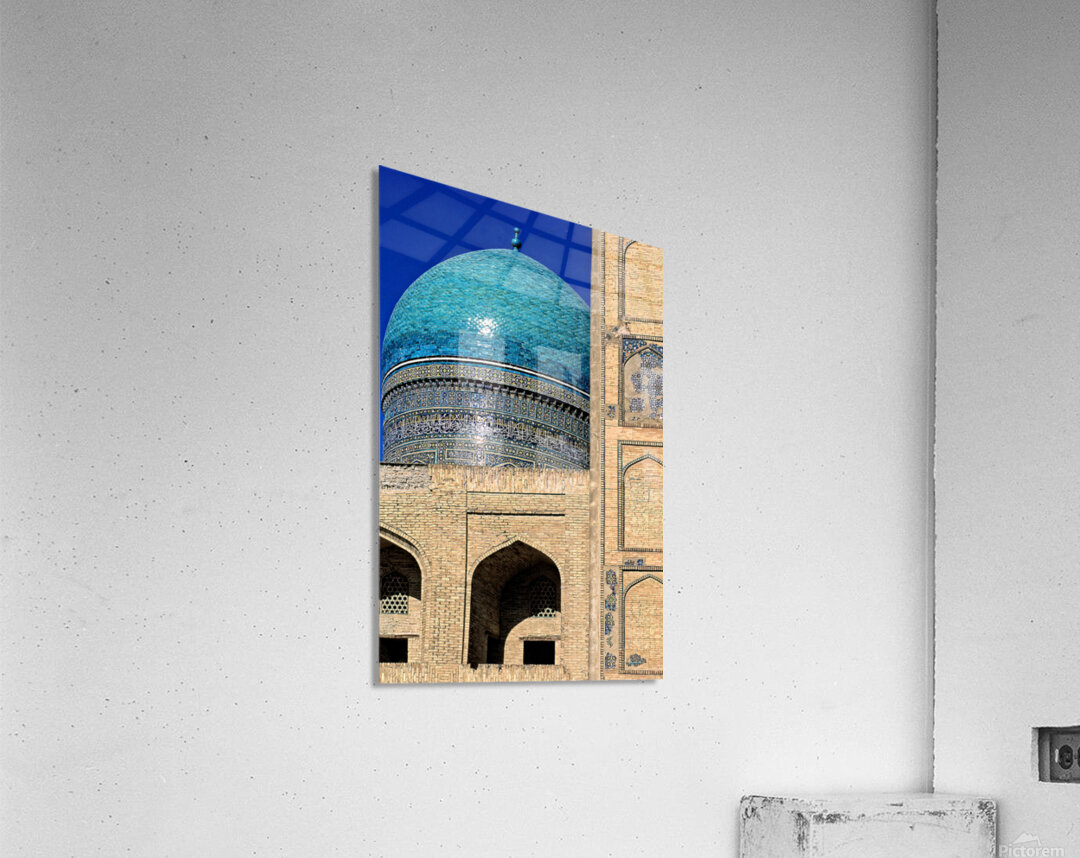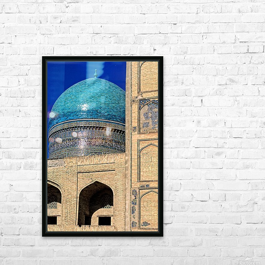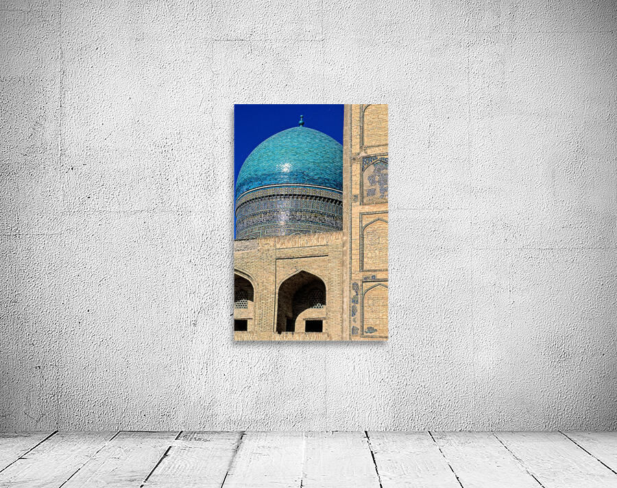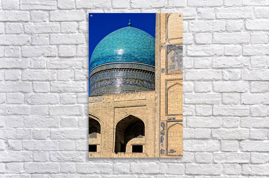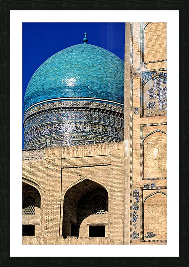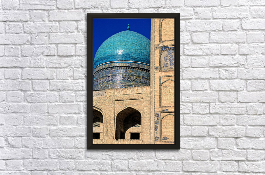 "Bukhara features blue dome of historical mosque during daylight" in a framed print.