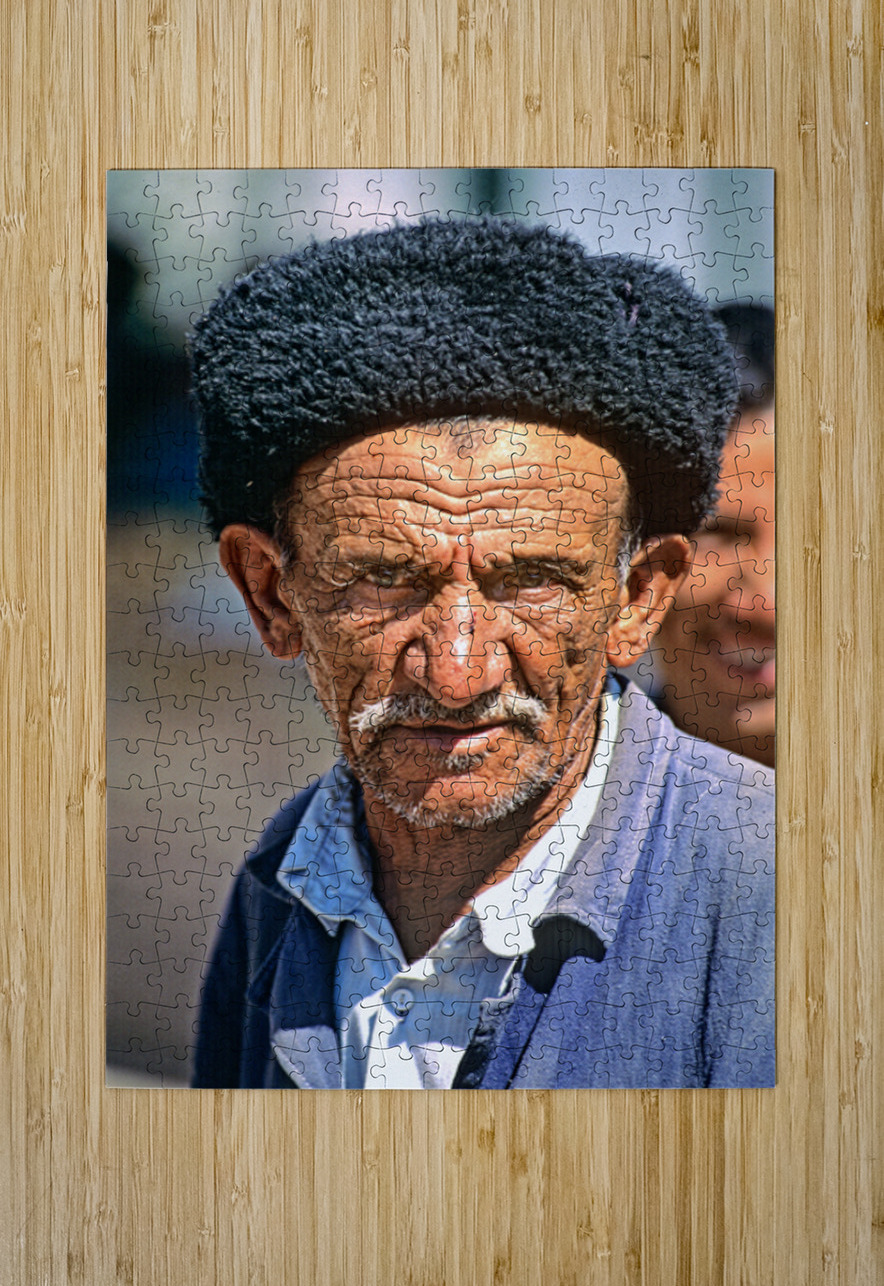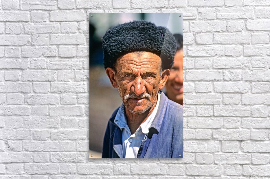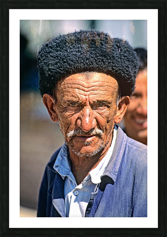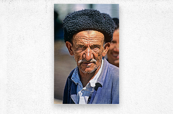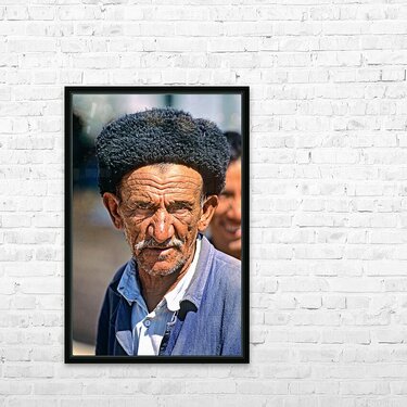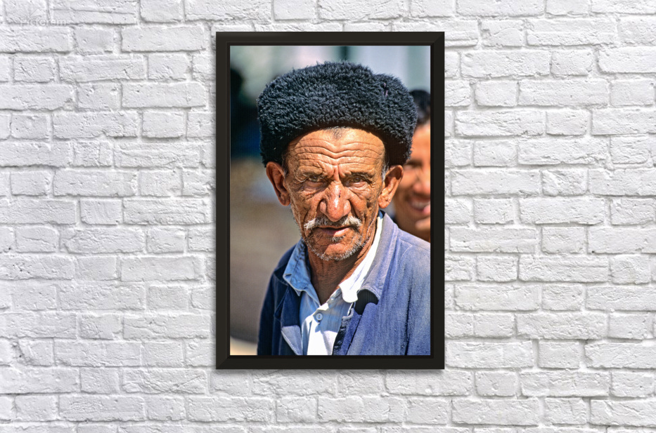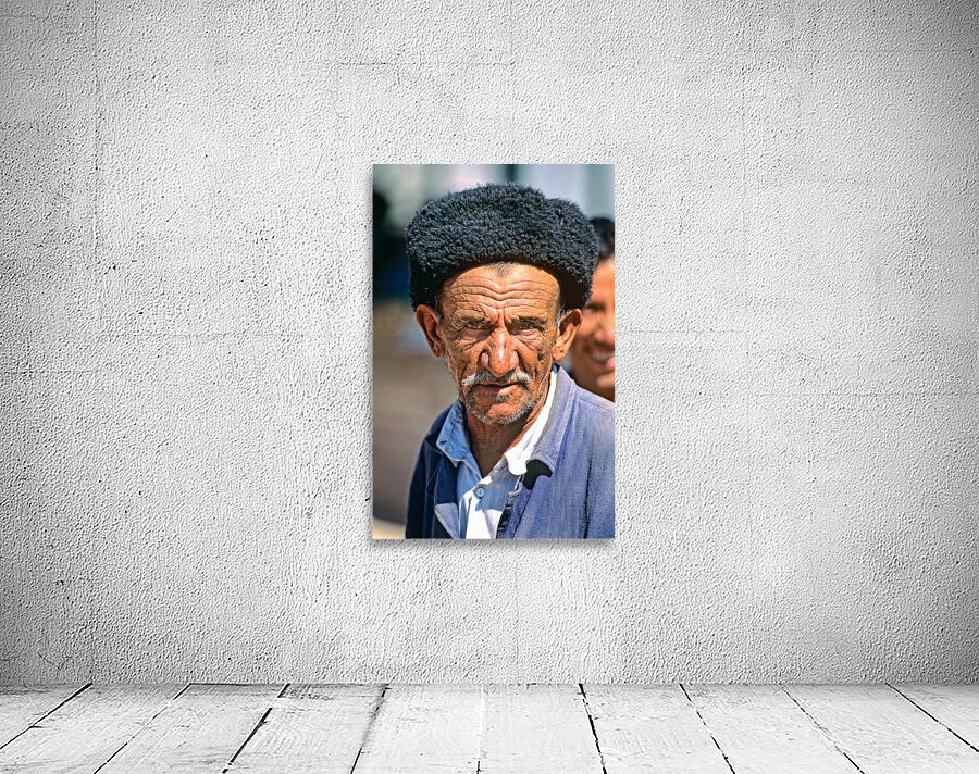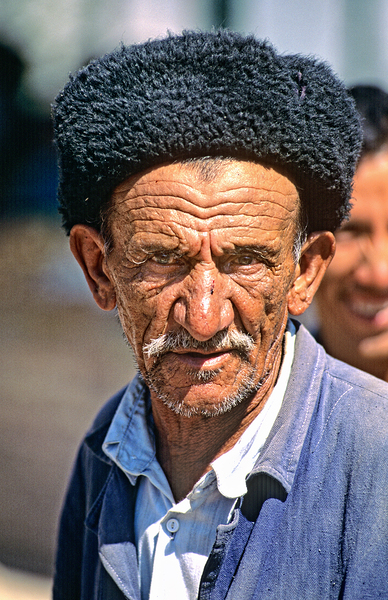 An older man stands in Khiva Uzbekistan. He wears a traditional hat and has distinct facial features. The sun shines down on him.