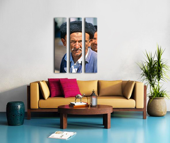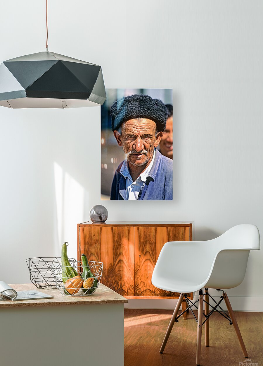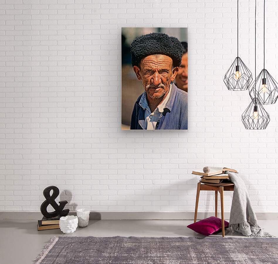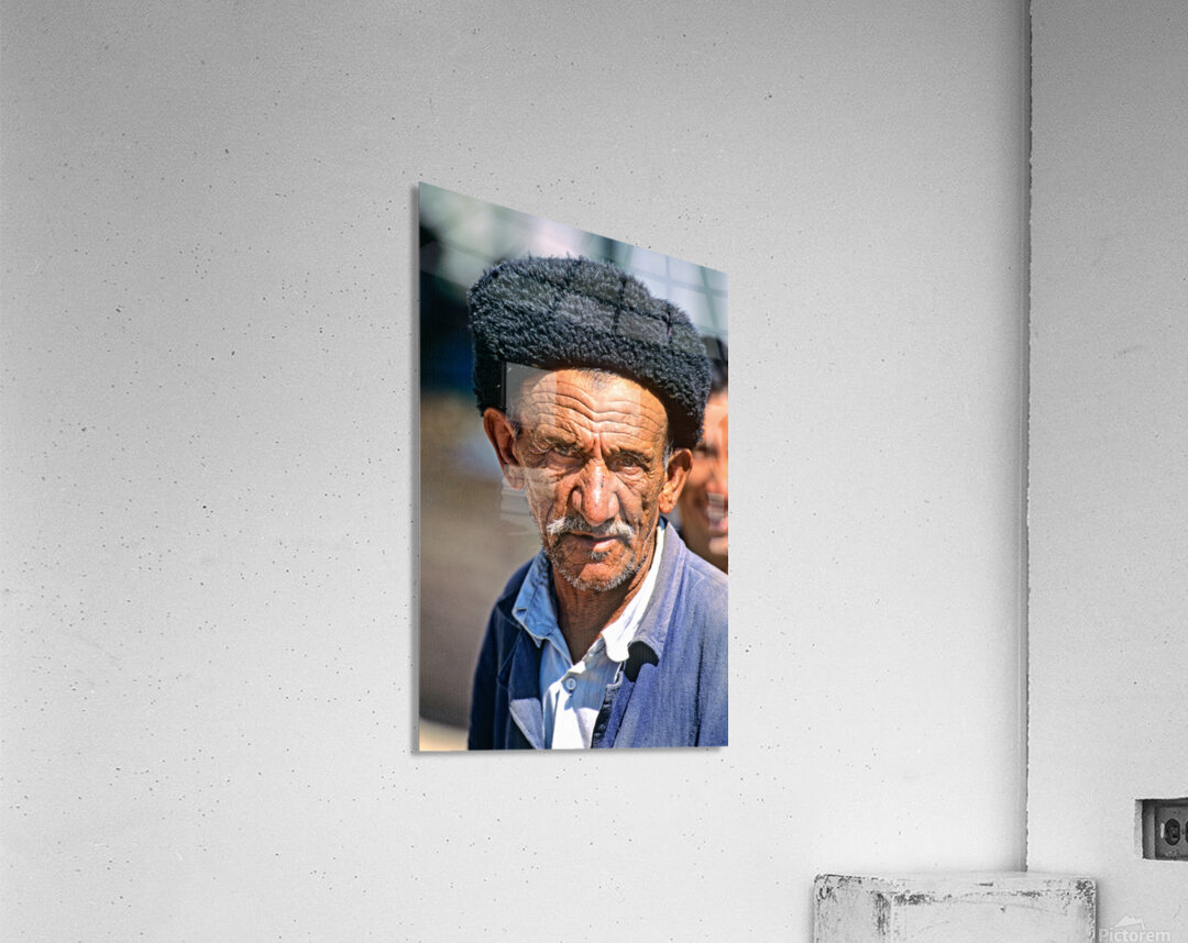 An older man stands in Khiva Uzbekistan. He wears a traditional hat and has distinct facial features. The sun shines down on him.