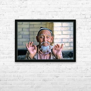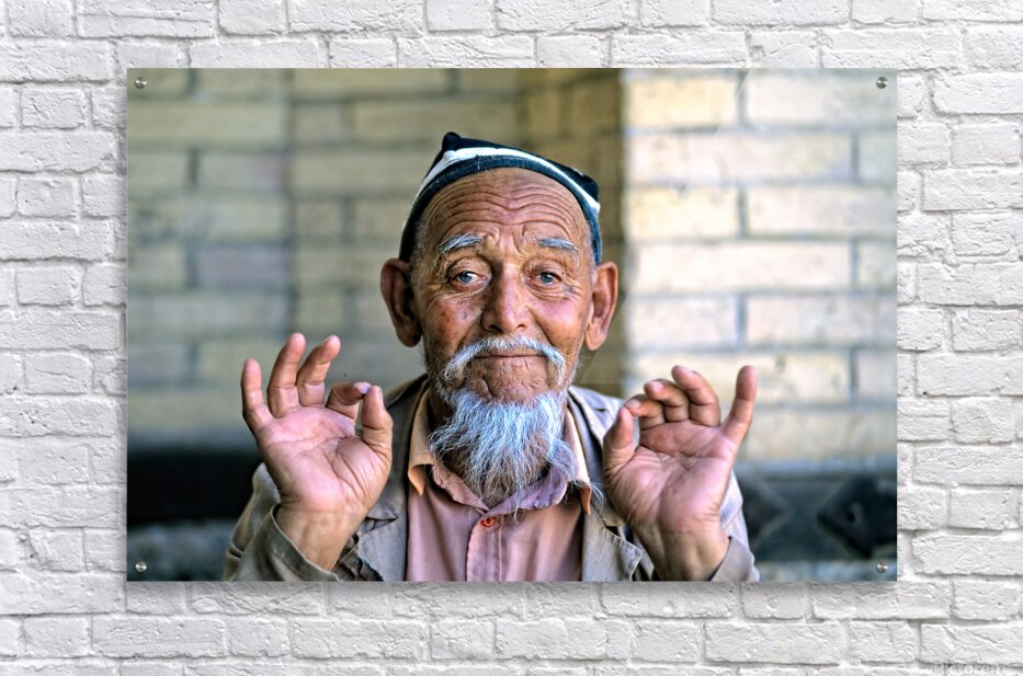 Get this artwork "Elderly man showing hand gestures in Khiva Uzbekistan" in a framed print.