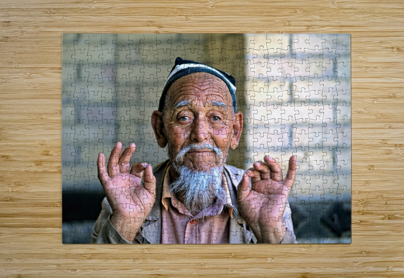 Elderly man showing hand gestures in Khiva Uzbekistan Marco Brivio Puzzle printing