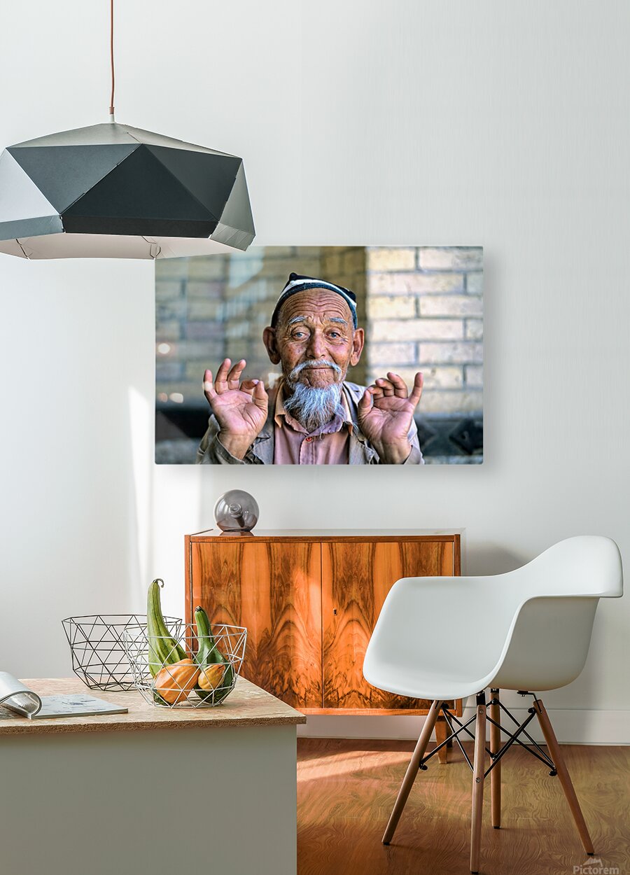 Elderly man showing hand gestures in Khiva Uzbekistan Picture Frame Printing