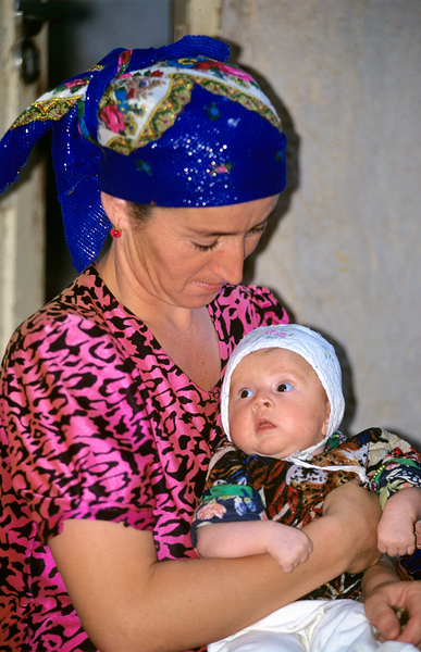 A woman holds her baby in Khiva Uzbekistan. They are part of daily life sharing a moment together in a warm setting.