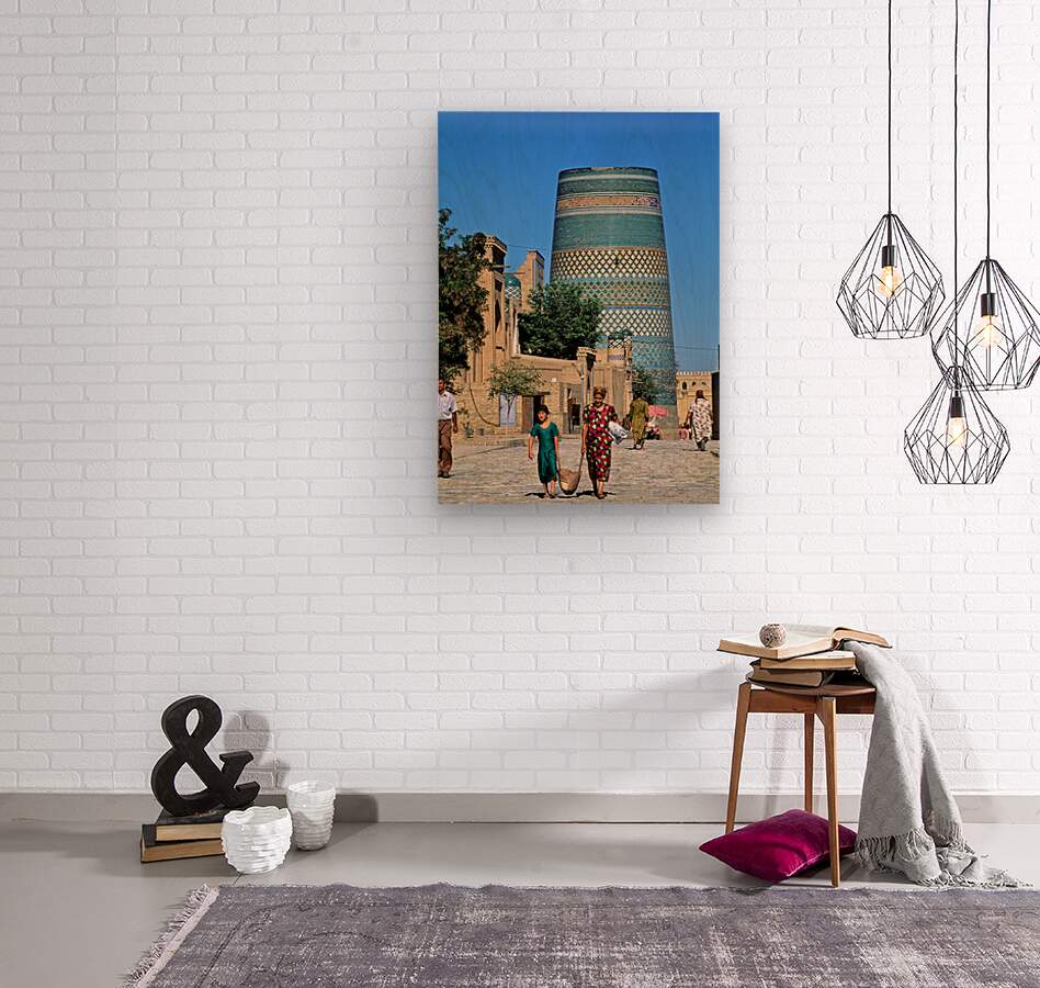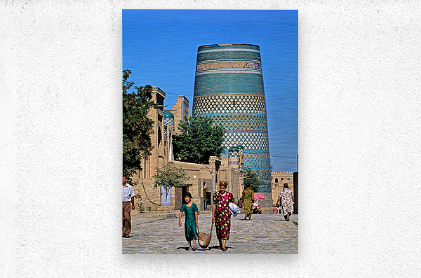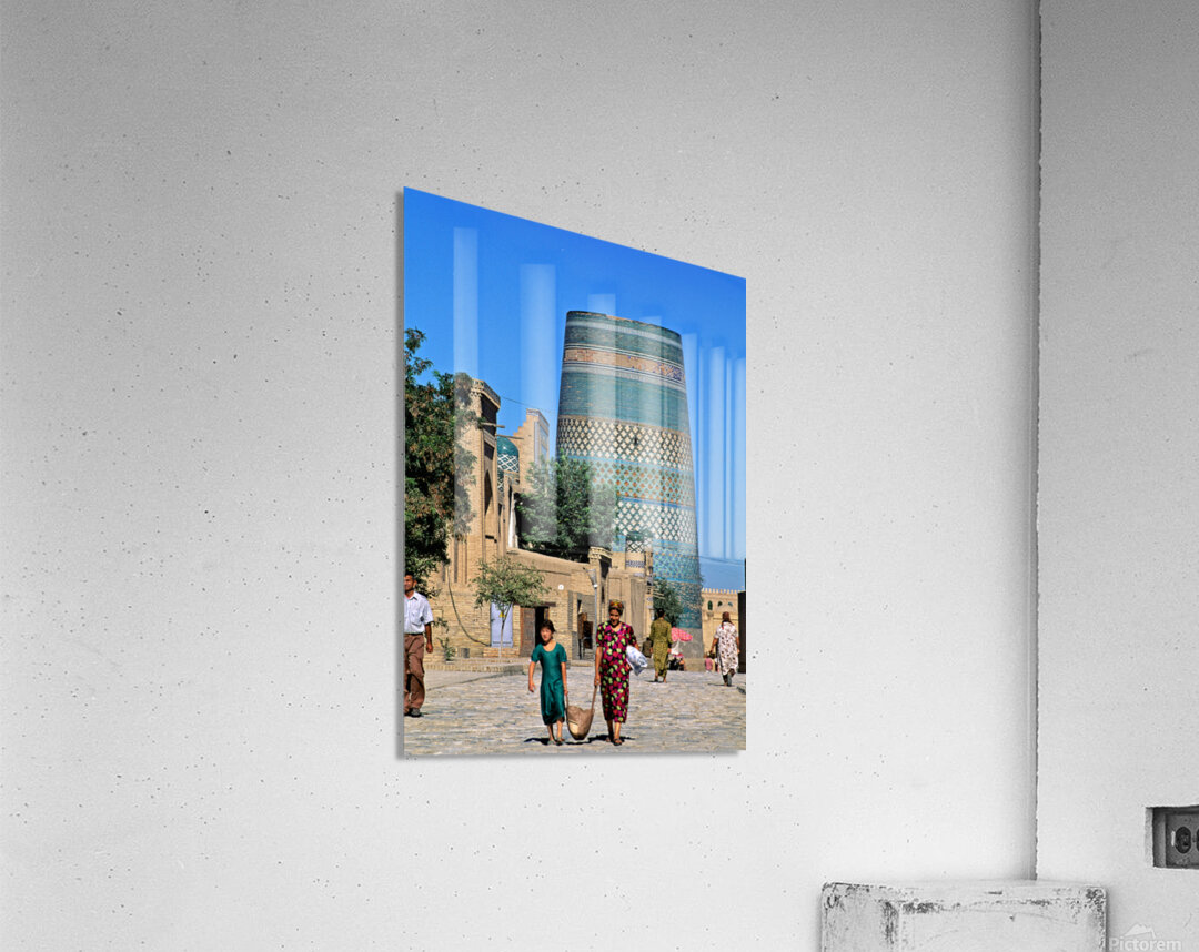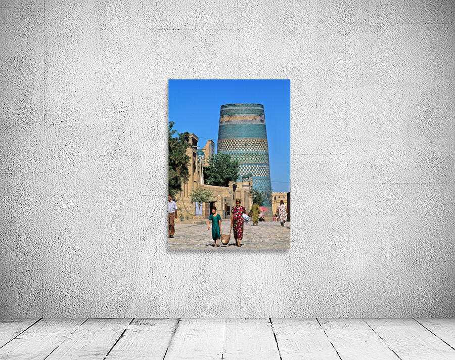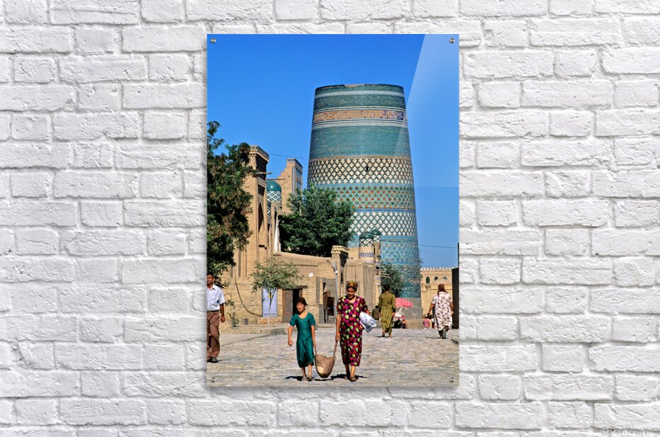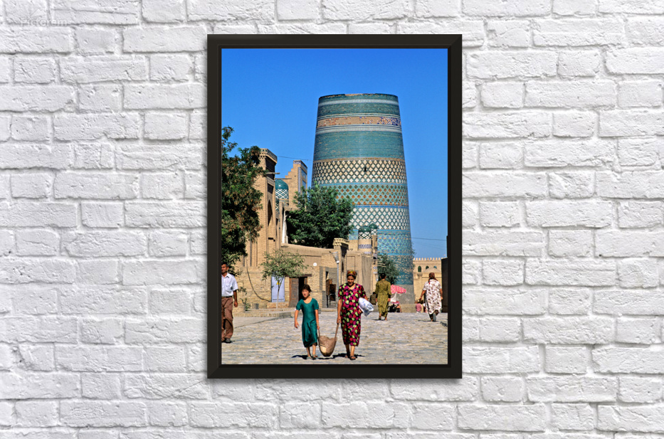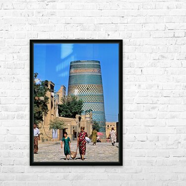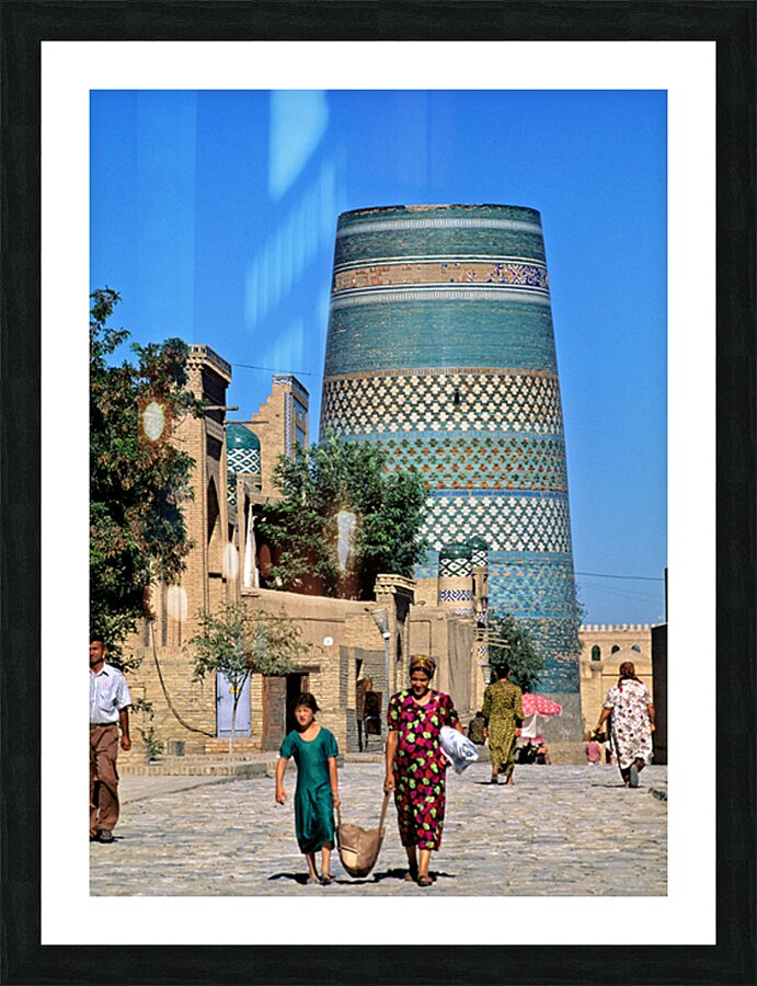 "Women and children walk by the tall tower in Khiva Uzbekistan" in a framed print.