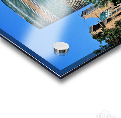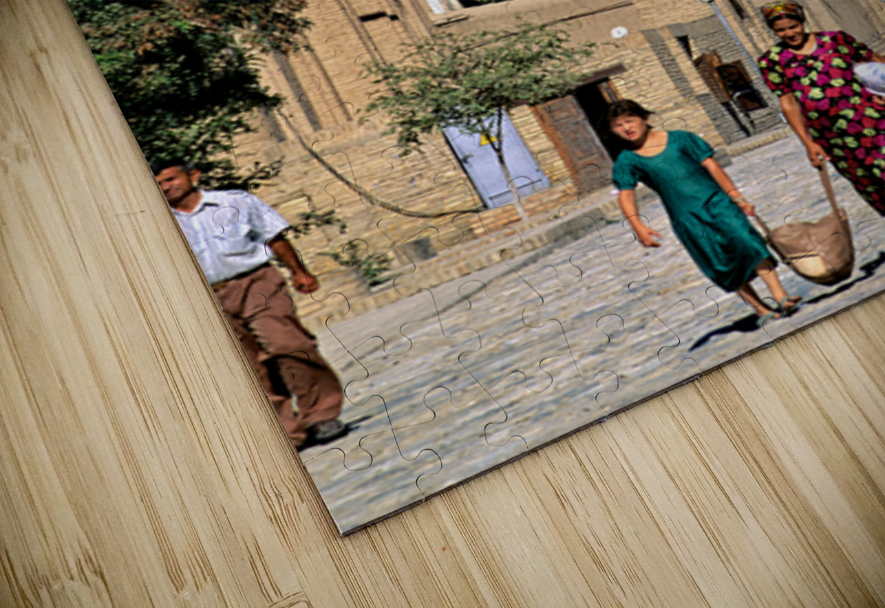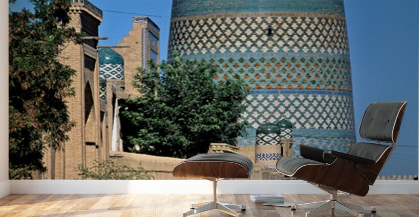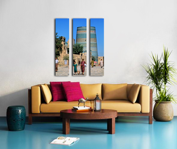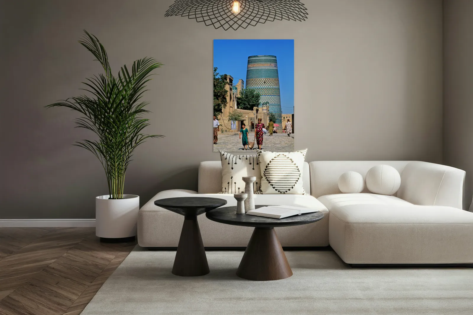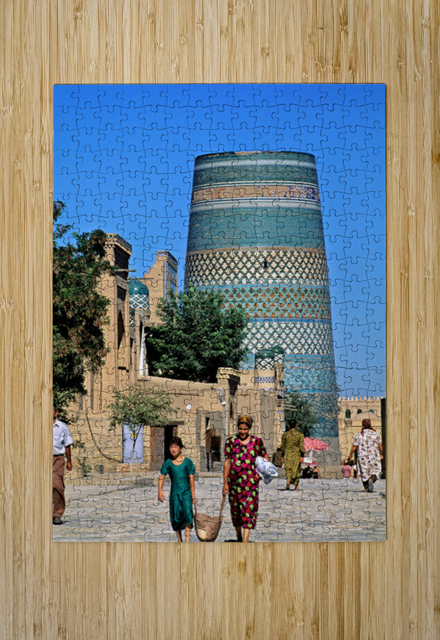 "Women and children walk by the tall tower in Khiva Uzbekistan" in a framed print.