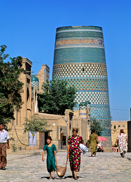 Two women and a girl walk down a stone street near a tall tower in Khiva Uzbekistan. The sky is clear and blue.
