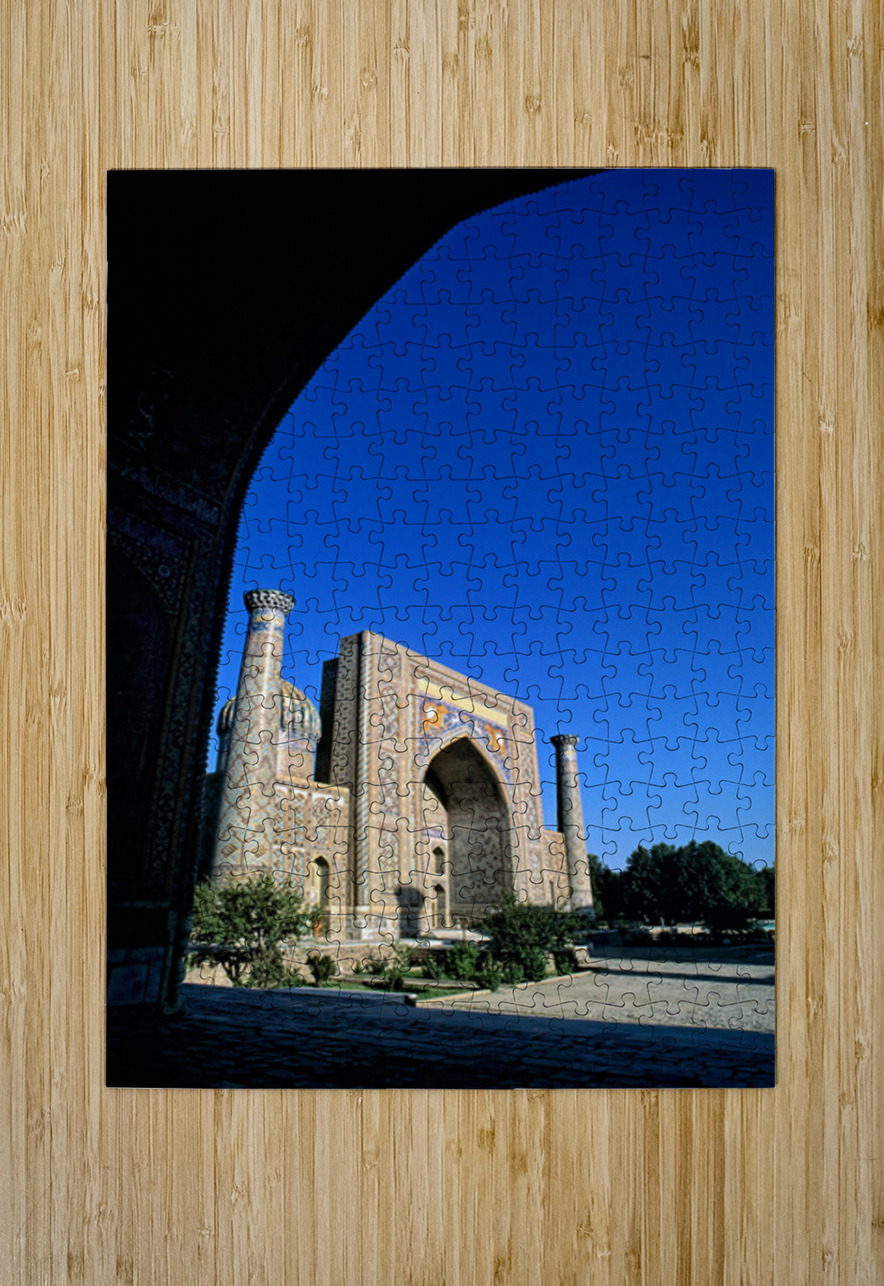 Visitors walk through the ancient streets of Khiva Uzbekistan observing the architectural details of the site. The clear sky enhances the view.