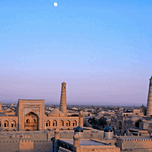 View of the ancient city of Khiva at sunset with its tall towers and structures under a clear sky. The moon hangs above the skyline.