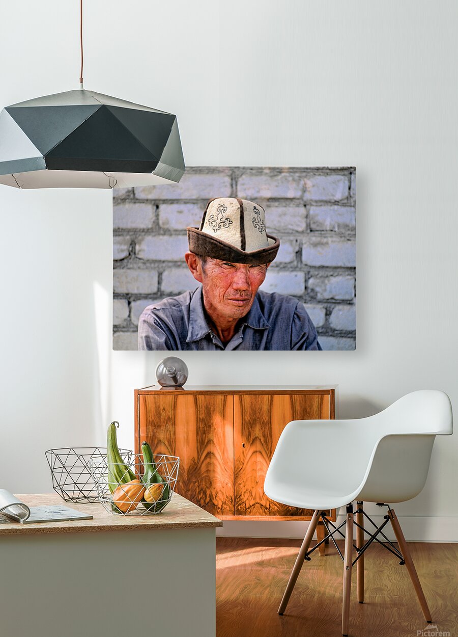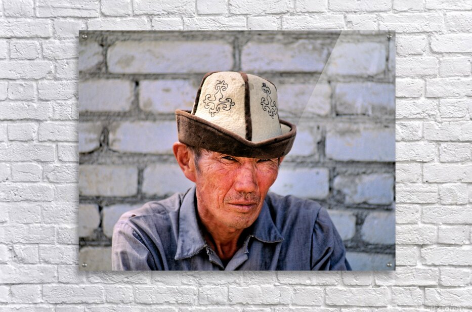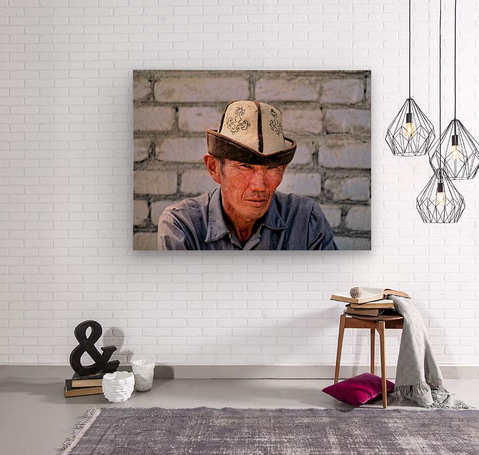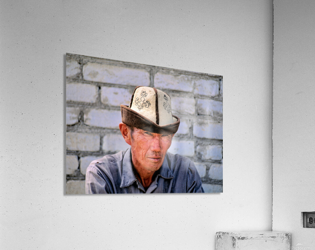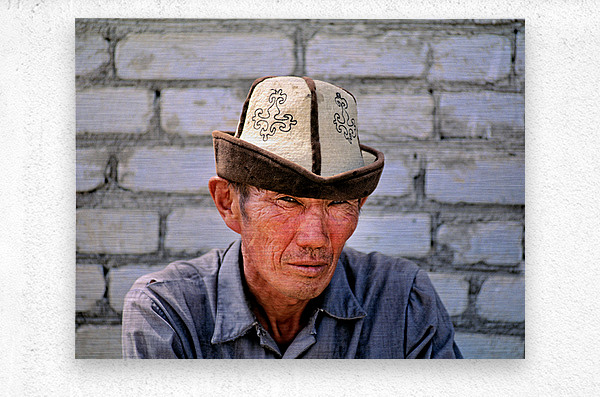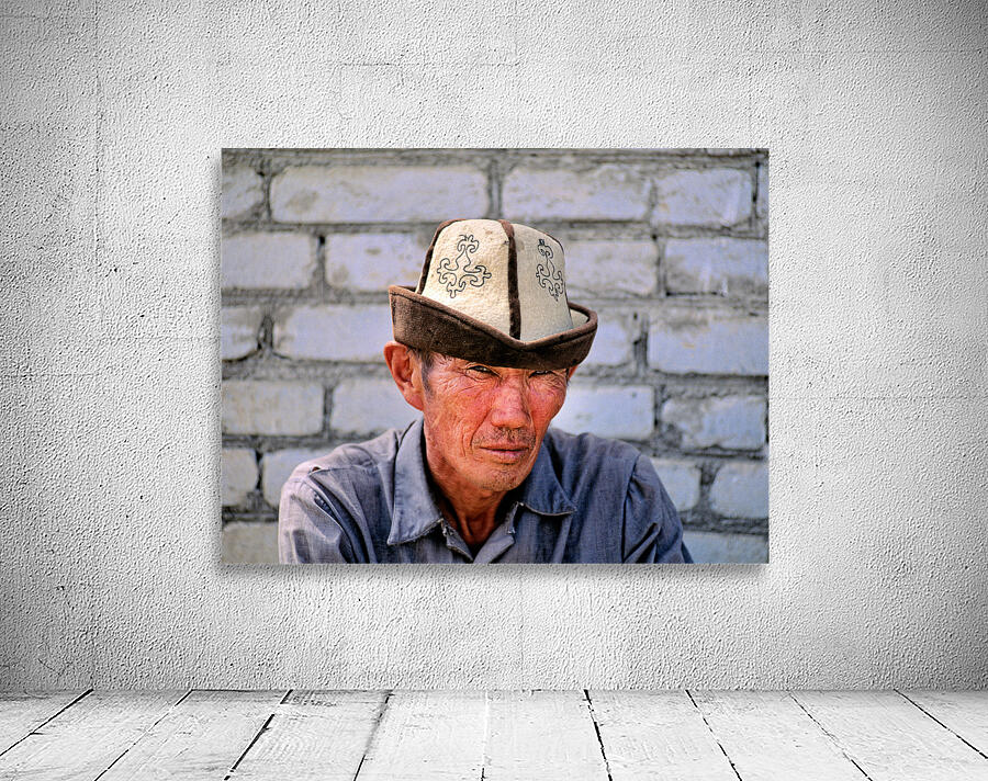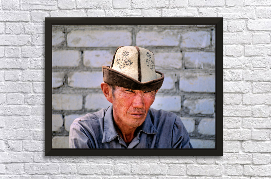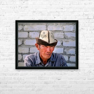 "Man in traditional hat sits against a brick wall in Bukhara" in a framed print.