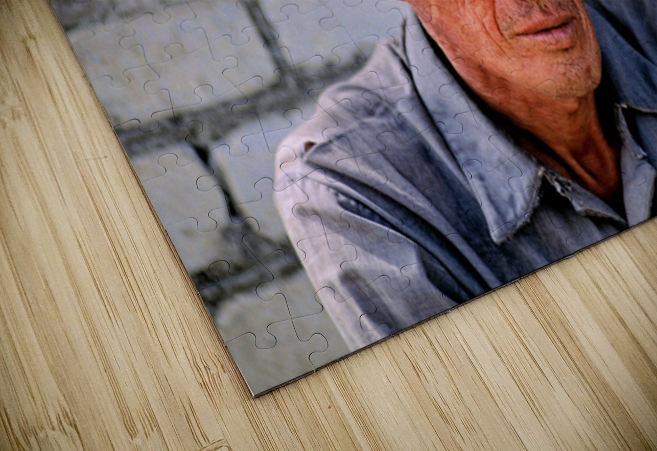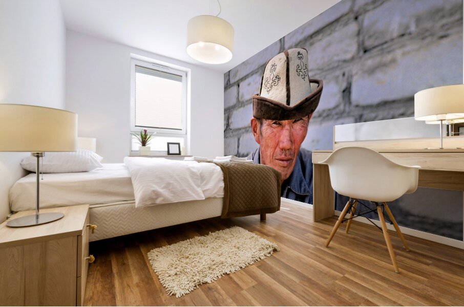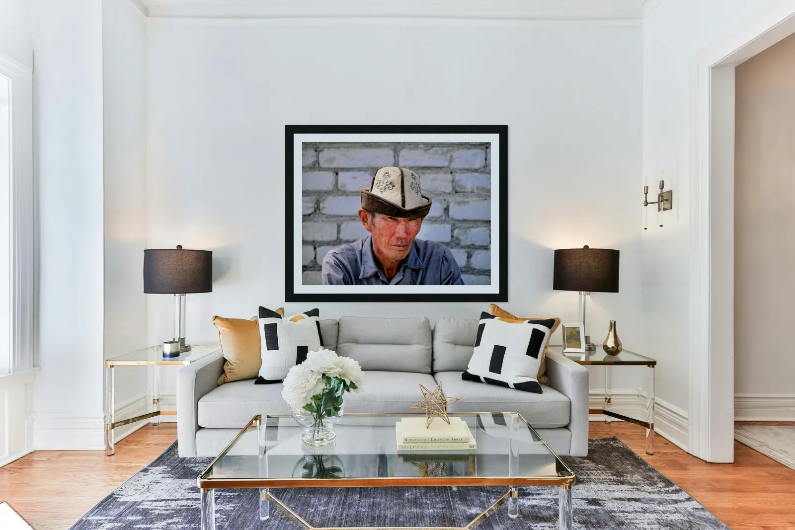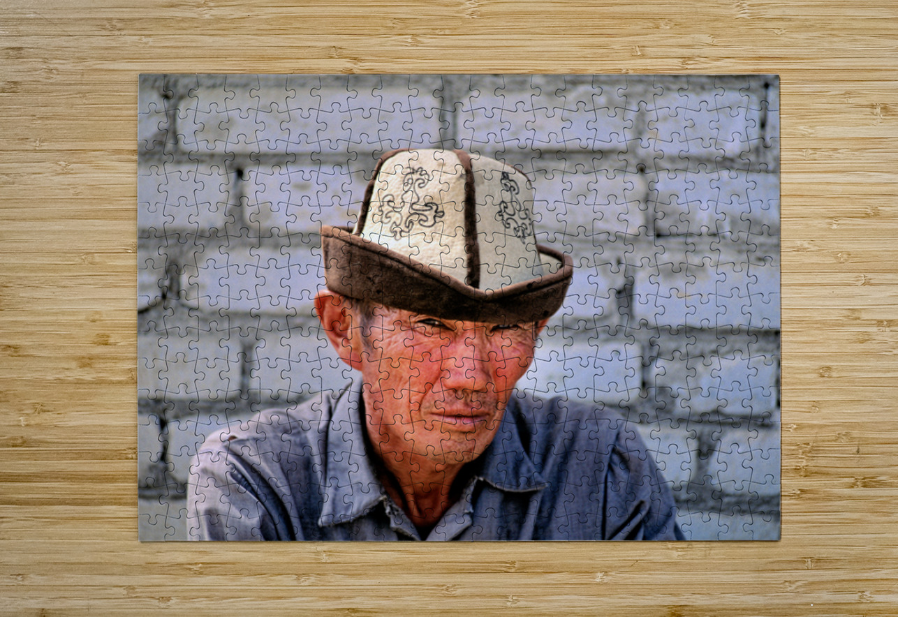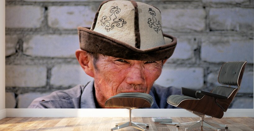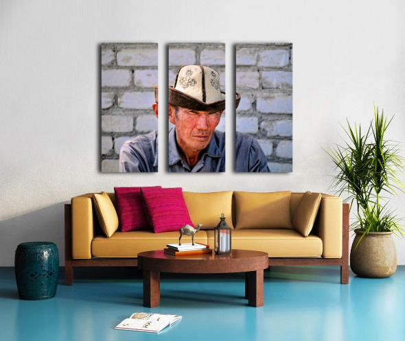 "Man in traditional hat sits against a brick wall in Bukhara" in a framed print.