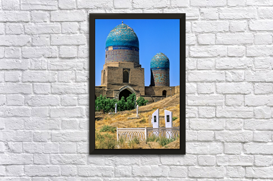 The cemetery in Samarkand shows two large blue domes. It features historical buildings and tombs set against a clear blue sky.