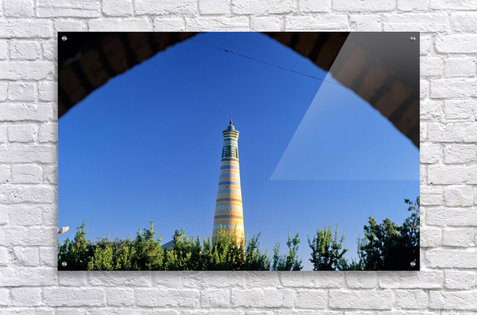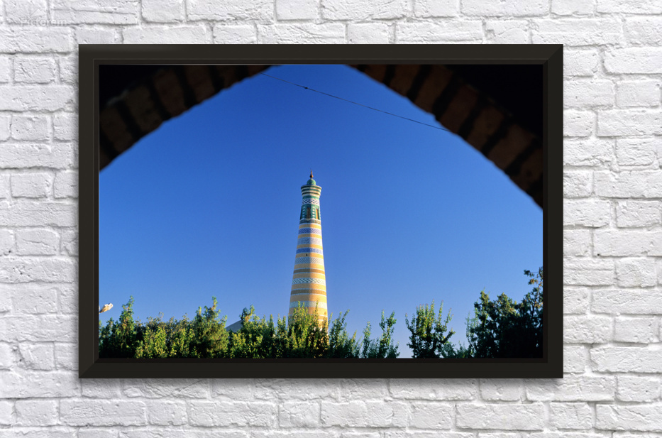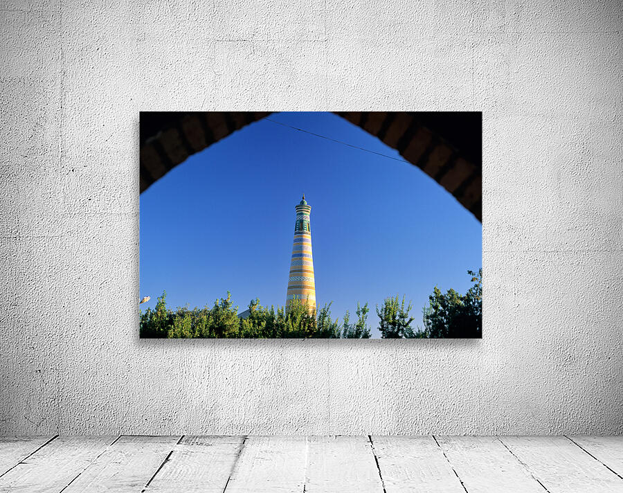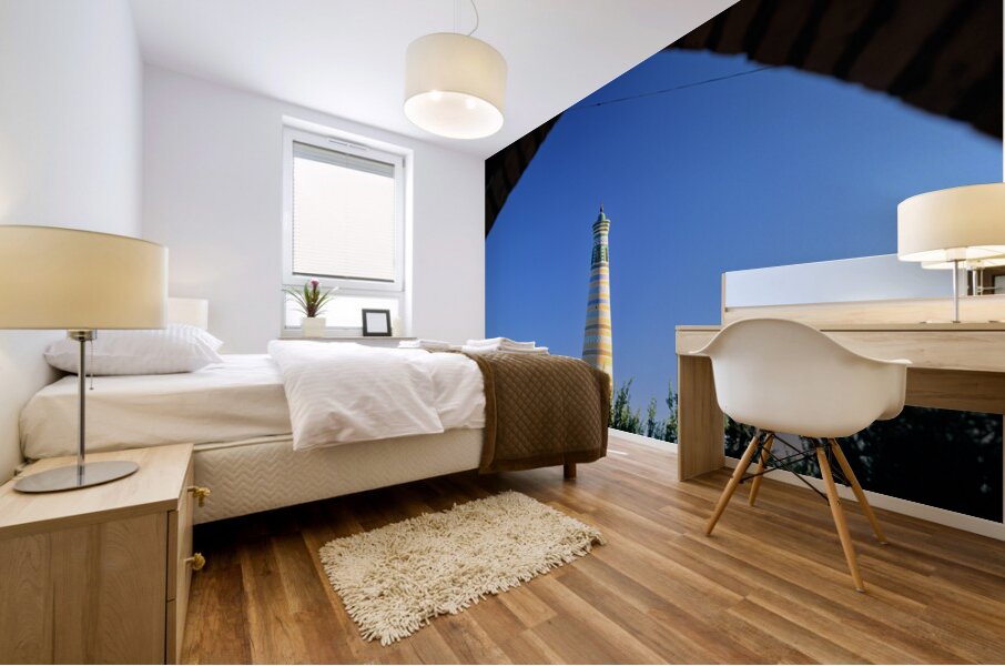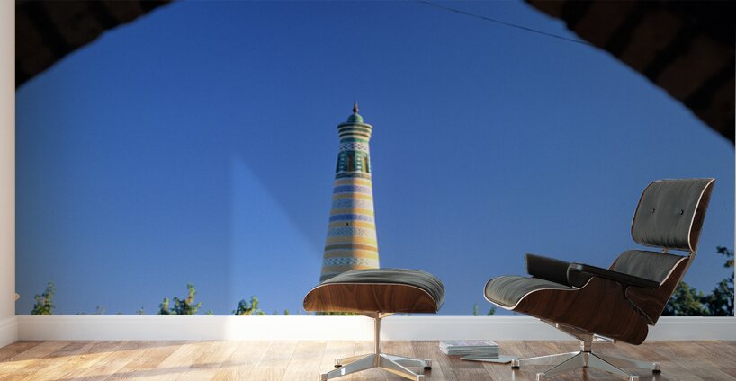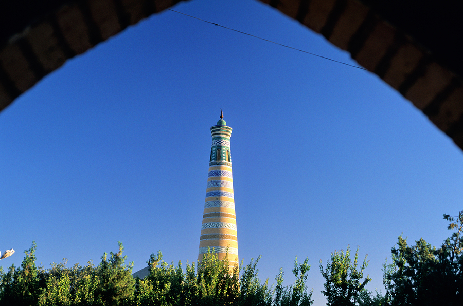 Visitors explore the famous minaret in Khiva during a sunny day. The structure stands tall against the clear blue sky.