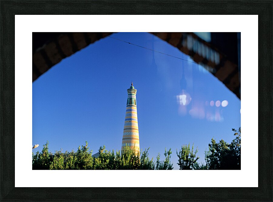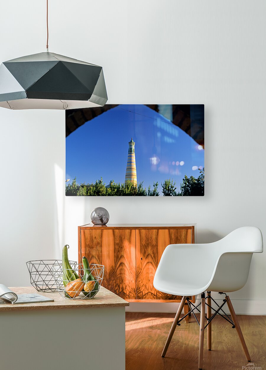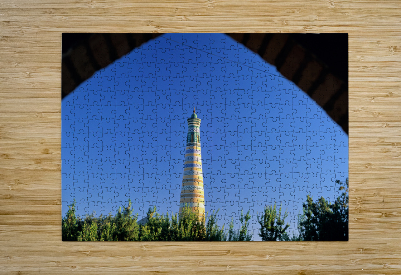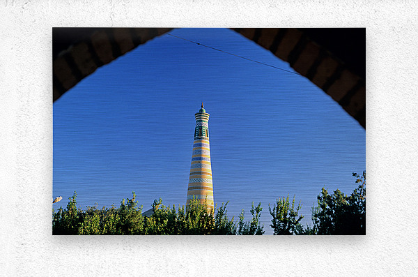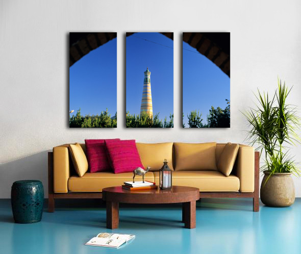 Visitors explore the famous minaret in Khiva during a sunny day. The structure stands tall against the clear blue sky.