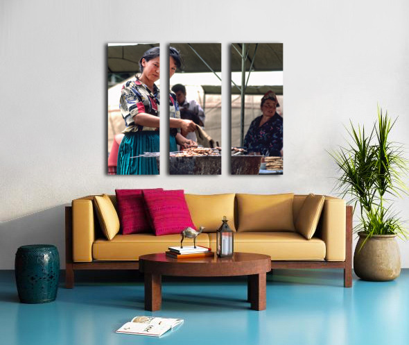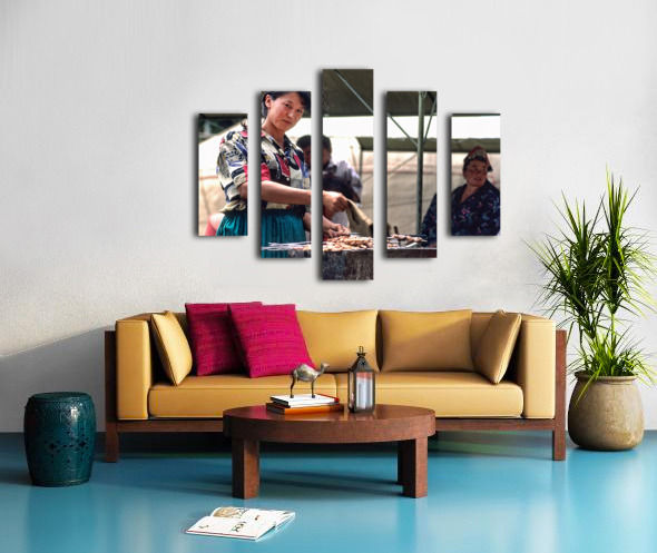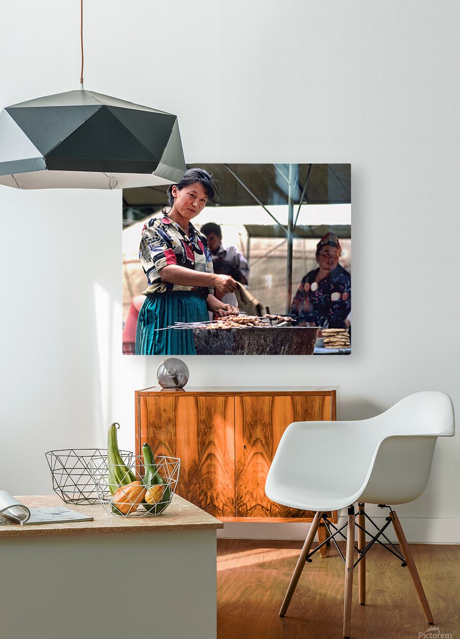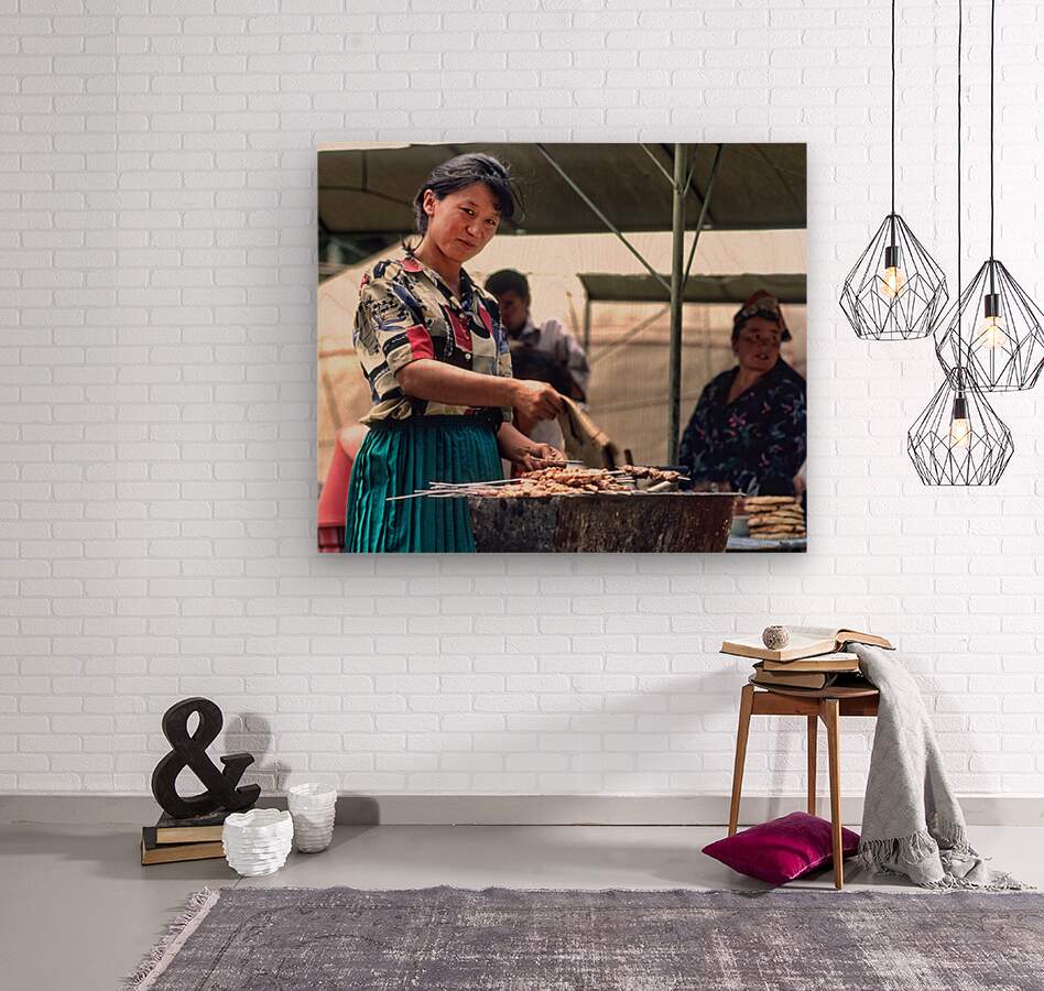 Street food vendors serve meat skewers in Samarkand Uzbekistan  Wood print