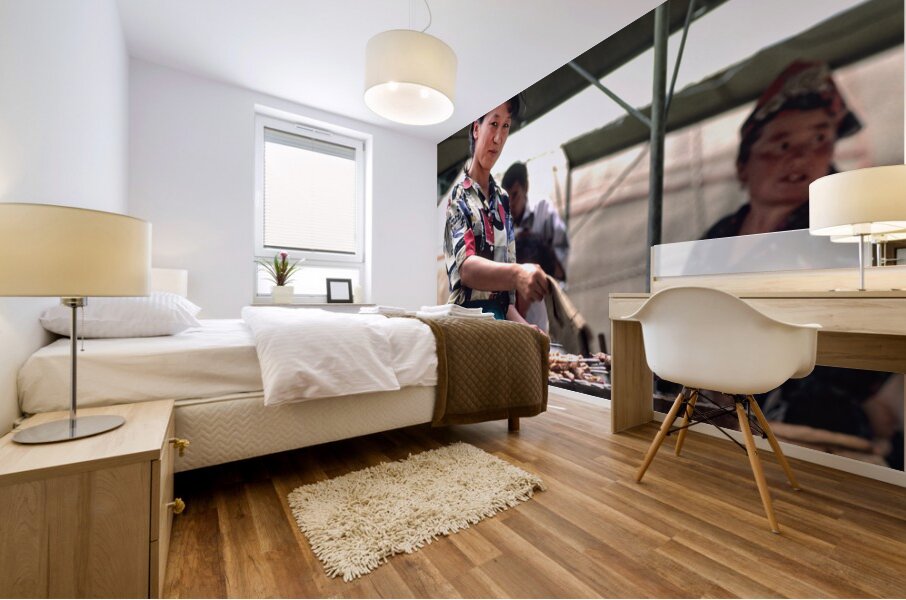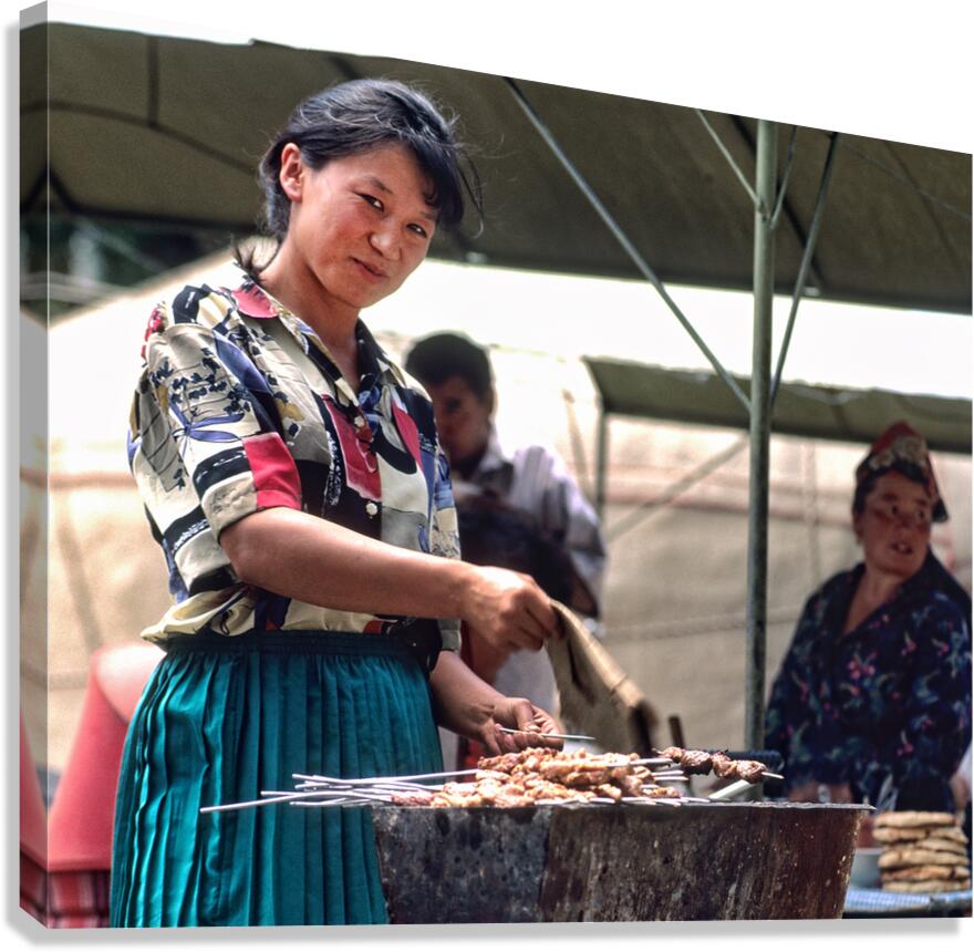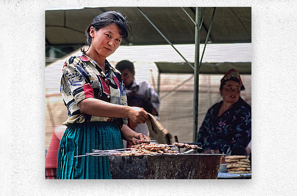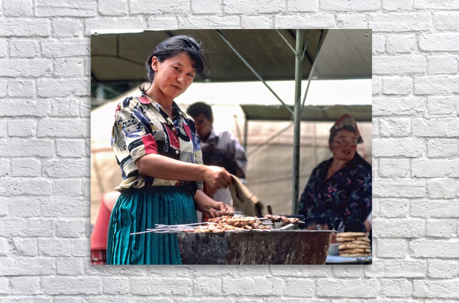 ABOUT THIS ARTWORK: STREET FOOD VENDORS SERVE MEAT SKEWERS IN SAMARKAND UZBEKISTAN