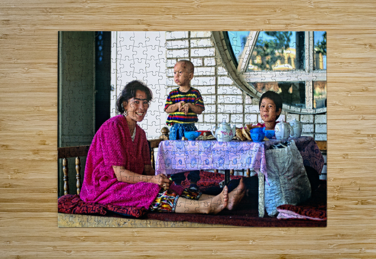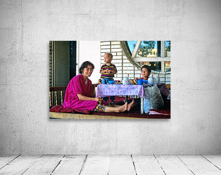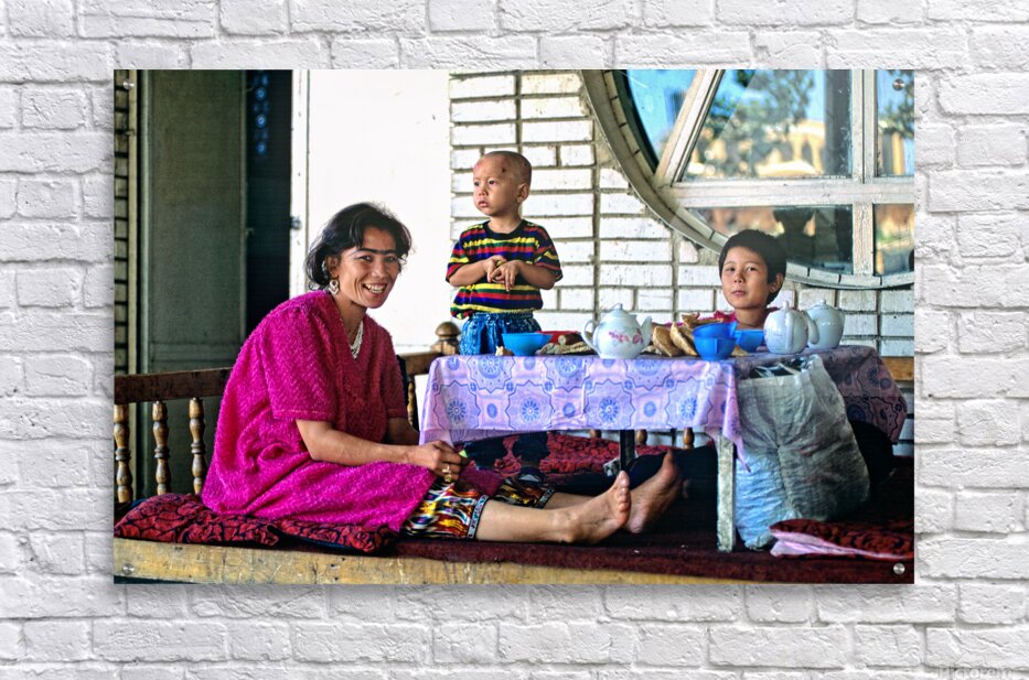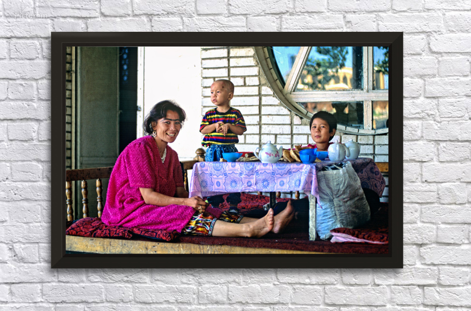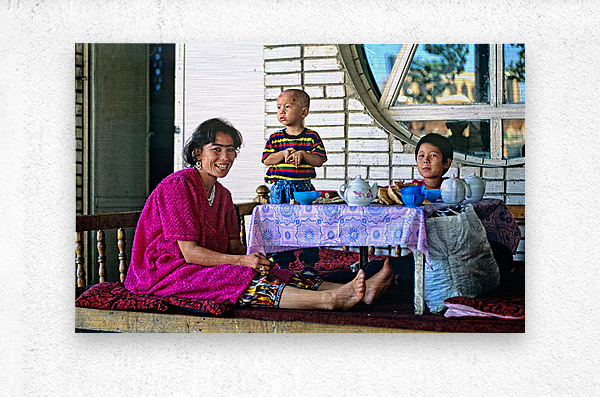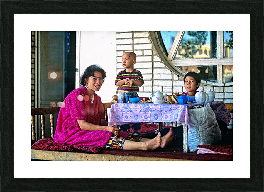 A family has lunch together at a table. Children are present as they share food in Samarkand Uzbekistan in a casual setting.