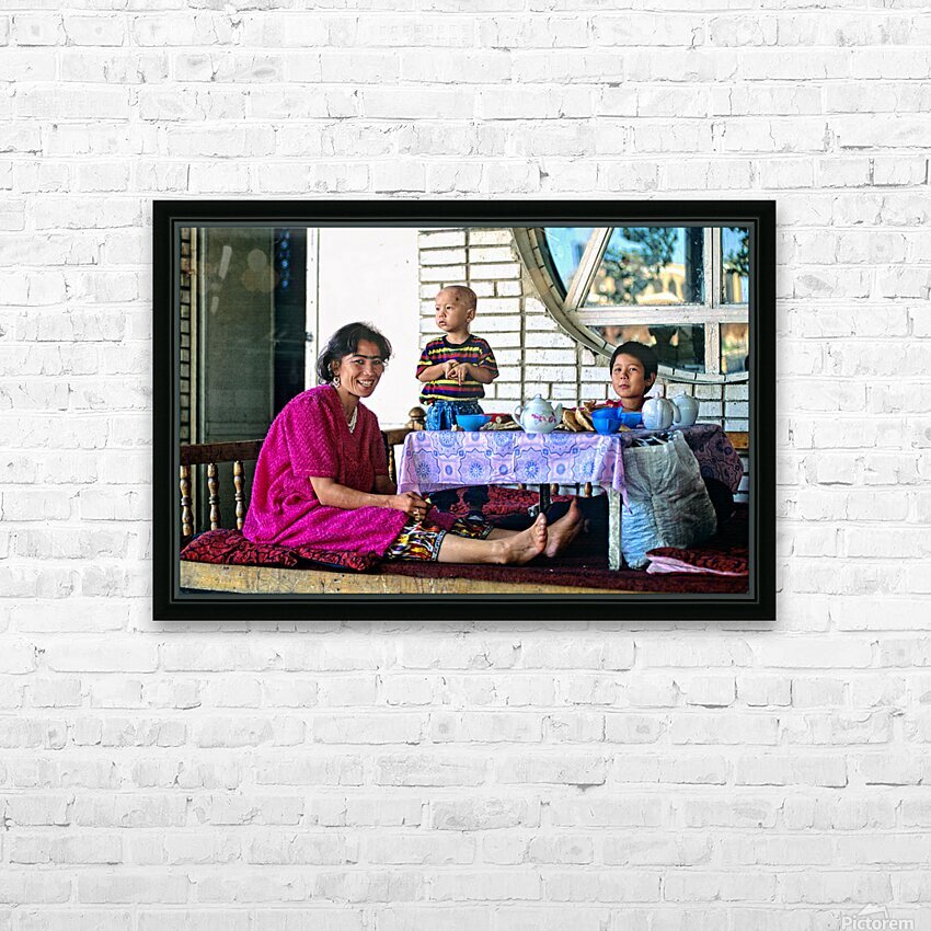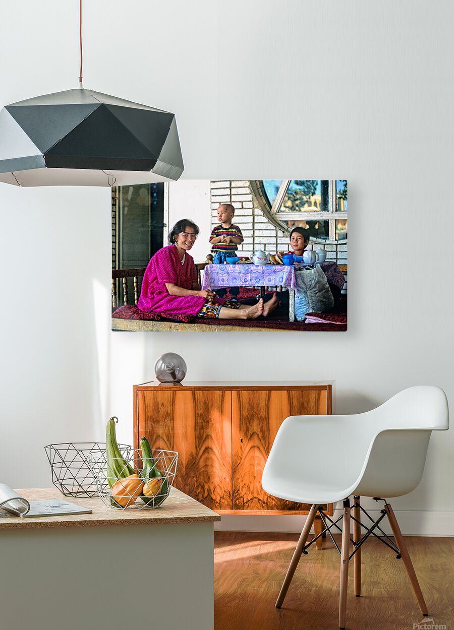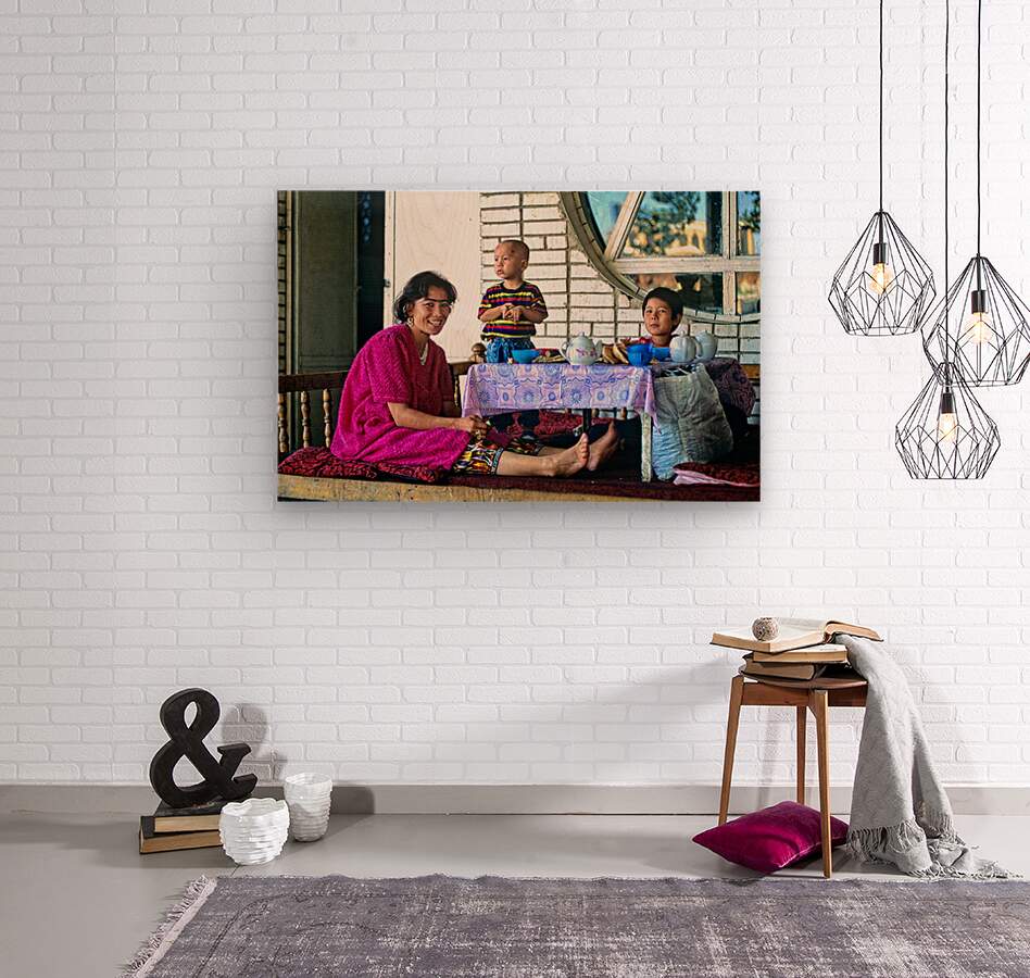 A family has lunch together at a table. Children are present as they share food in Samarkand Uzbekistan in a casual setting.