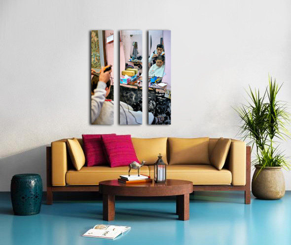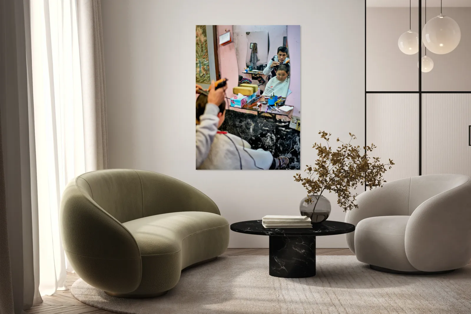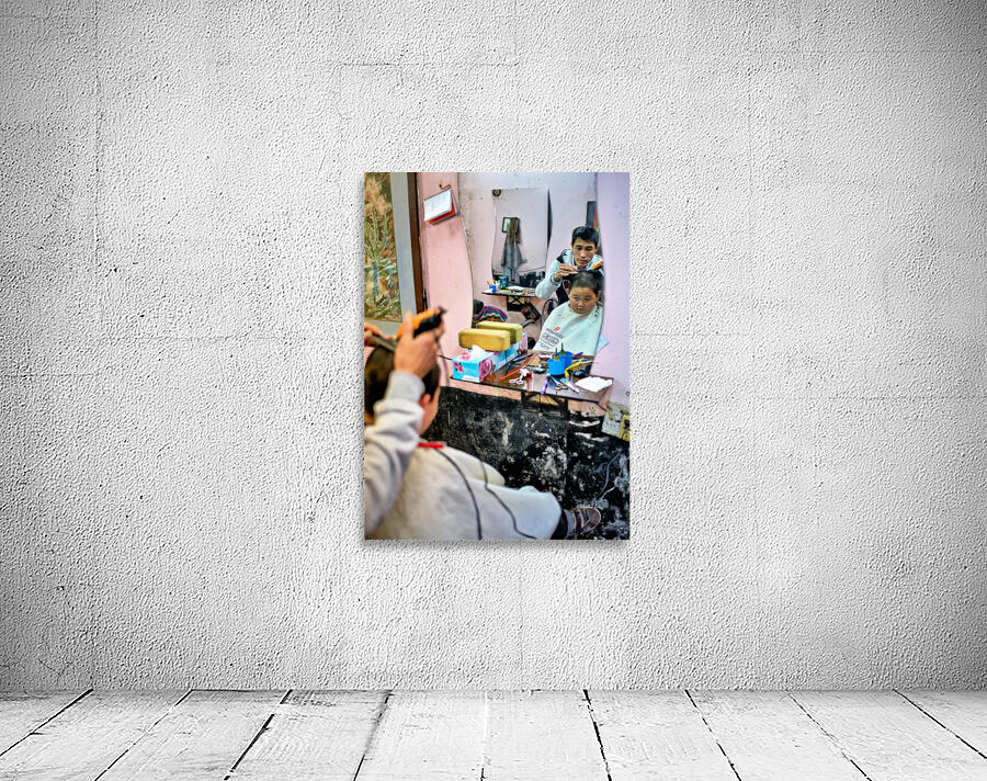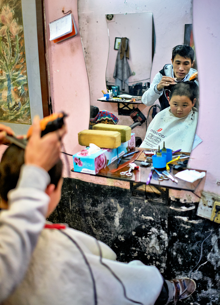 A boy sits in a chair while a barber cuts his hair in a simple barbershop in Hanoi. A mirror shows their work and the shops decor.
