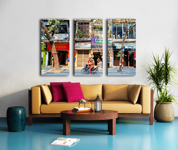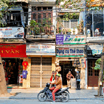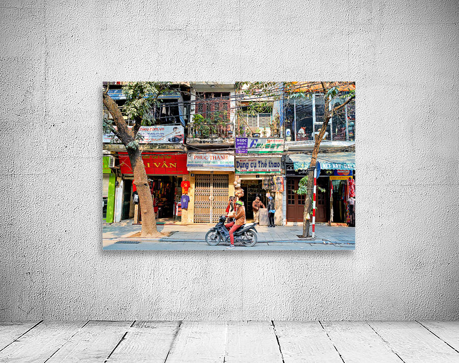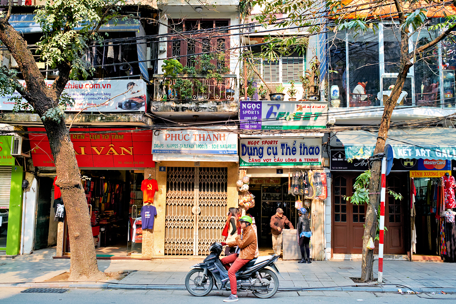 A person rides a motorcycle on a busy street in Hanoi Vietnam. Shops line the street with signs in Vietnamese. Trees are nearby.