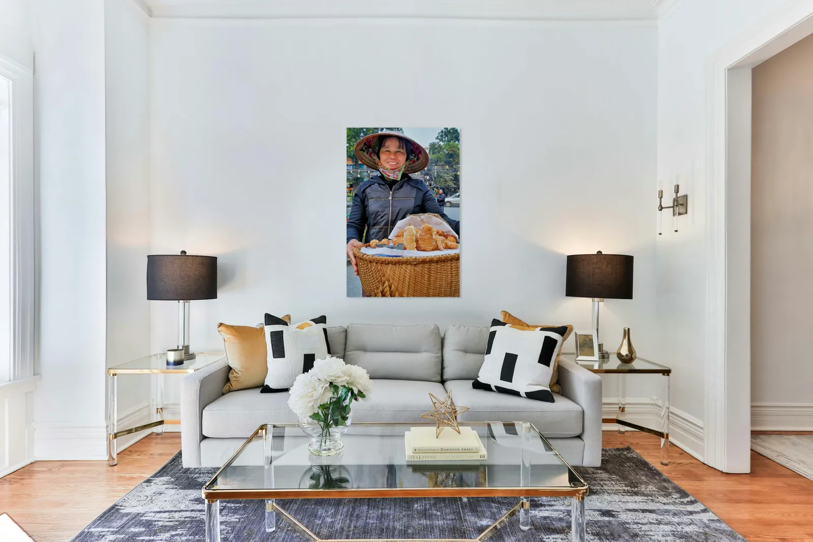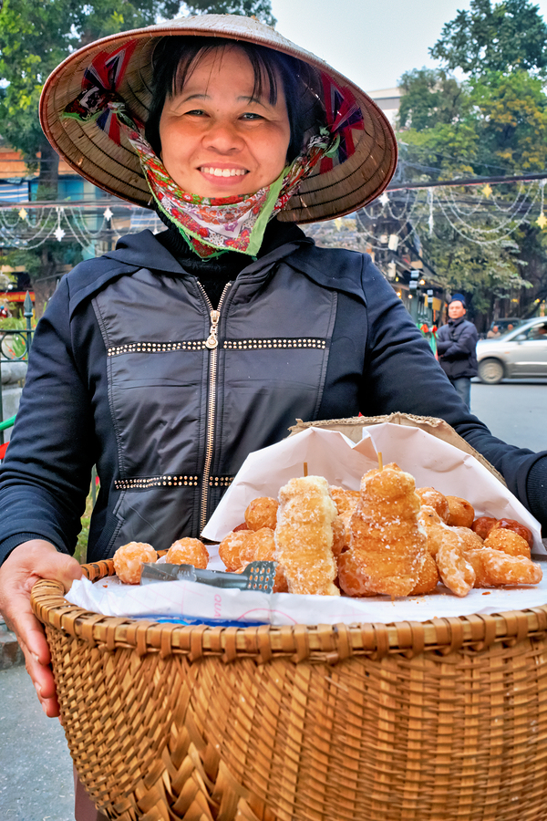 A woman offers snacks from a basket on the street in Hanoi. She wears a traditional hat and greets passersby with a smile.