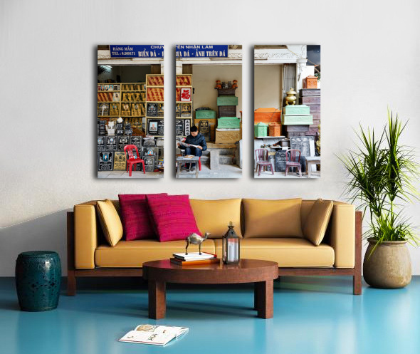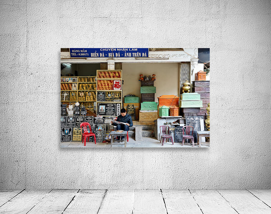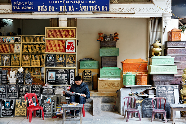 A man sits outside a shop in Hanoi Vietnam reading a book. Various stone items are displayed around him.